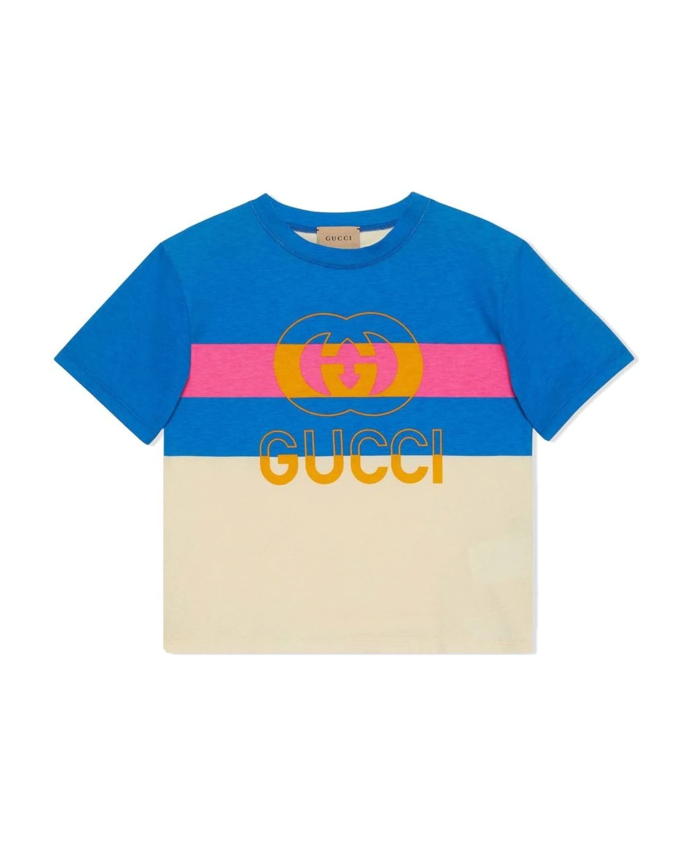 Blue cotton T-shirt featuring signature Web-stripe trim, signature Interlocking G logo, round neck, short sleeves, straight hem Composition: 100% Cotton