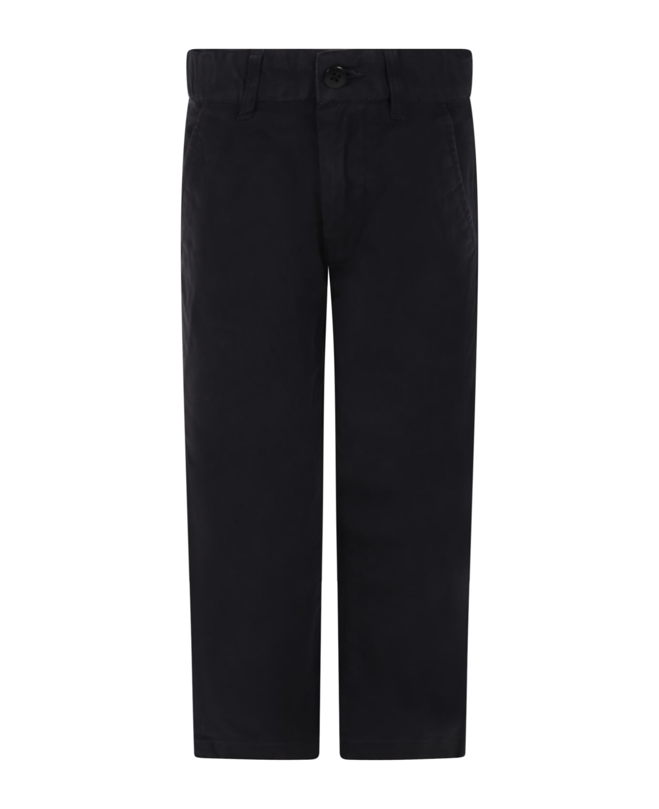 Blue trousers with adjustable waist thanks to internal elastics with button, belt loops, button and zip closure, side pockets and pocket on the back. They are embellished with white patches on the back.