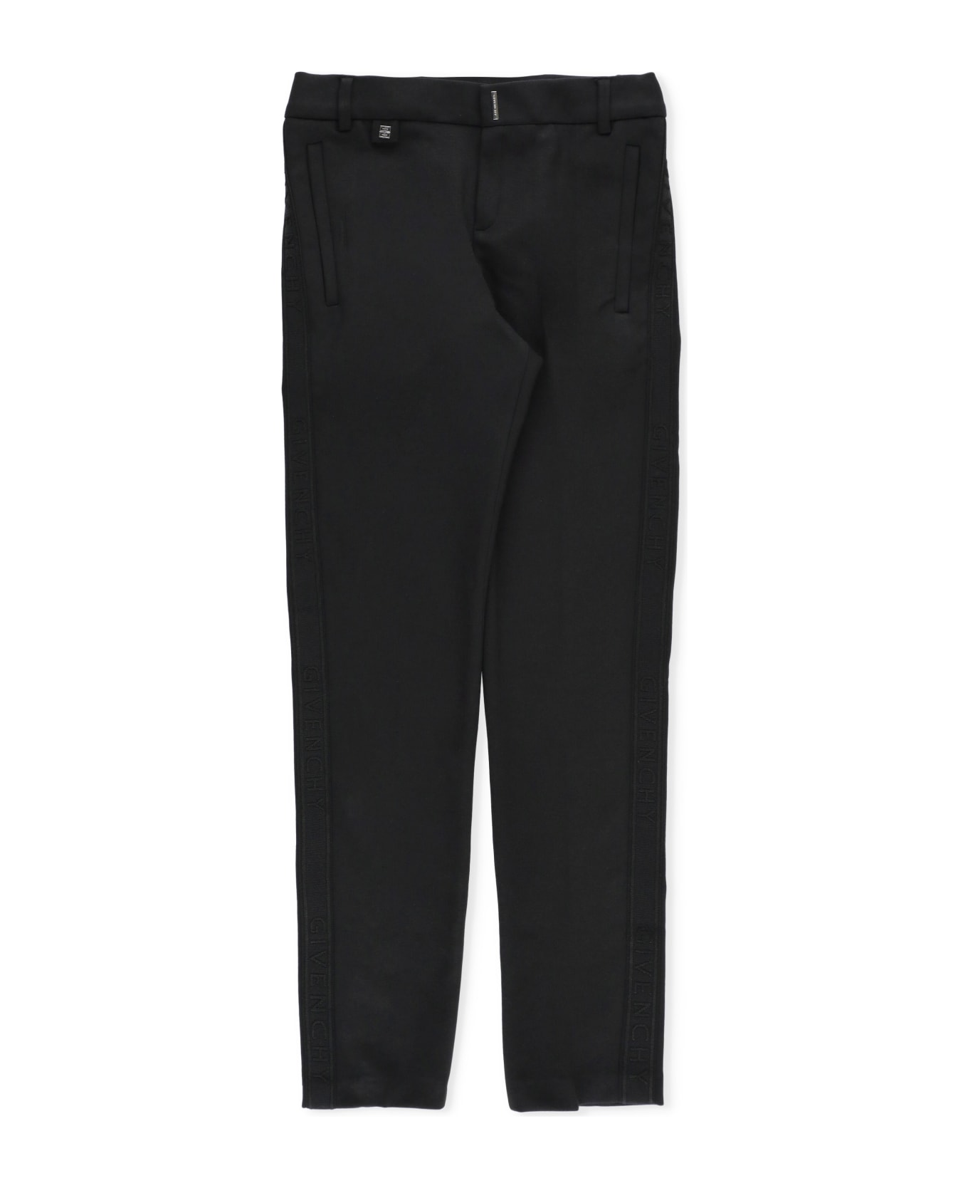 - Black Givenchy Junior cotton blend trousers for boy - Belt loops - Front zip and snap button fastening - Two side slit pockets - Two rear welt pockets - Front metal logo - Rear contrasting color logoed print - Two side gros grain bands with tone on tone embroidered logo