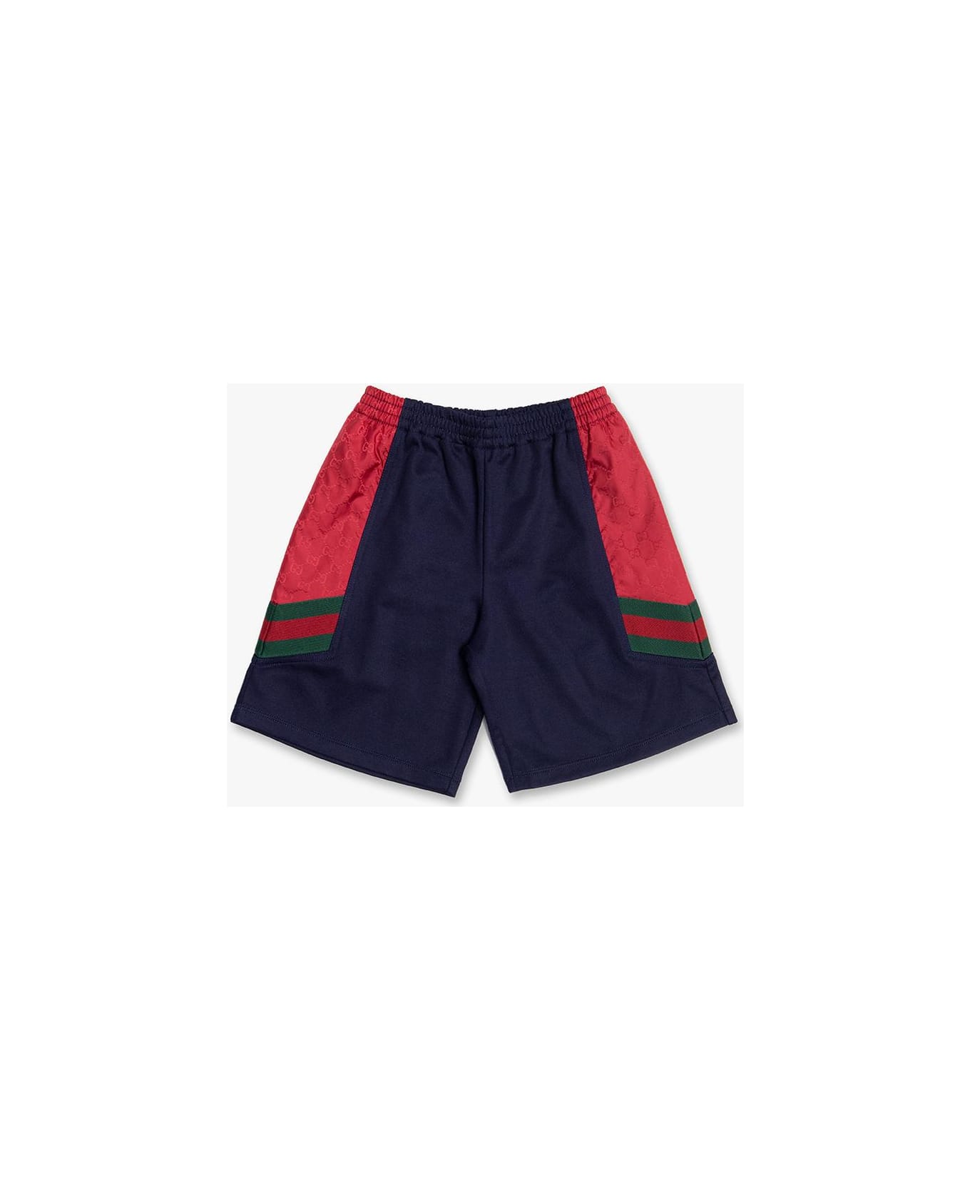 Navy blue and red panelled shorts from Gucci Kids. Embellished with the brand's signature green and red 'Web' stripe, this pair features the 'GG' pattern and an elasticated waistband. Composition: 55% Polyester 45% Cotton