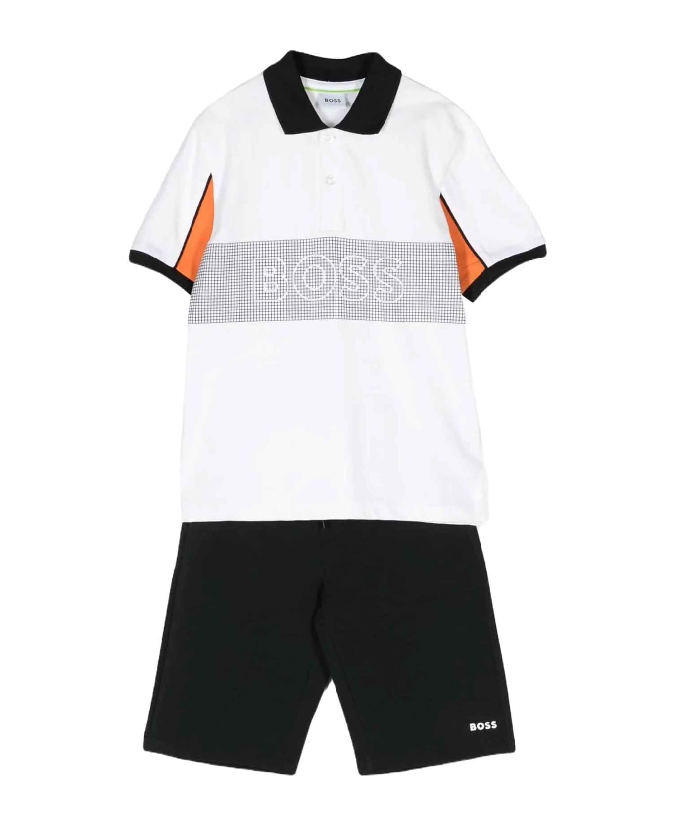 White suit boy. Logo print on the front, polo style collar, front button placket, short sleeves, elasticated drawstring waist, front embossed logo and two side welt pockets. Cotton 96%, Elastane 4%