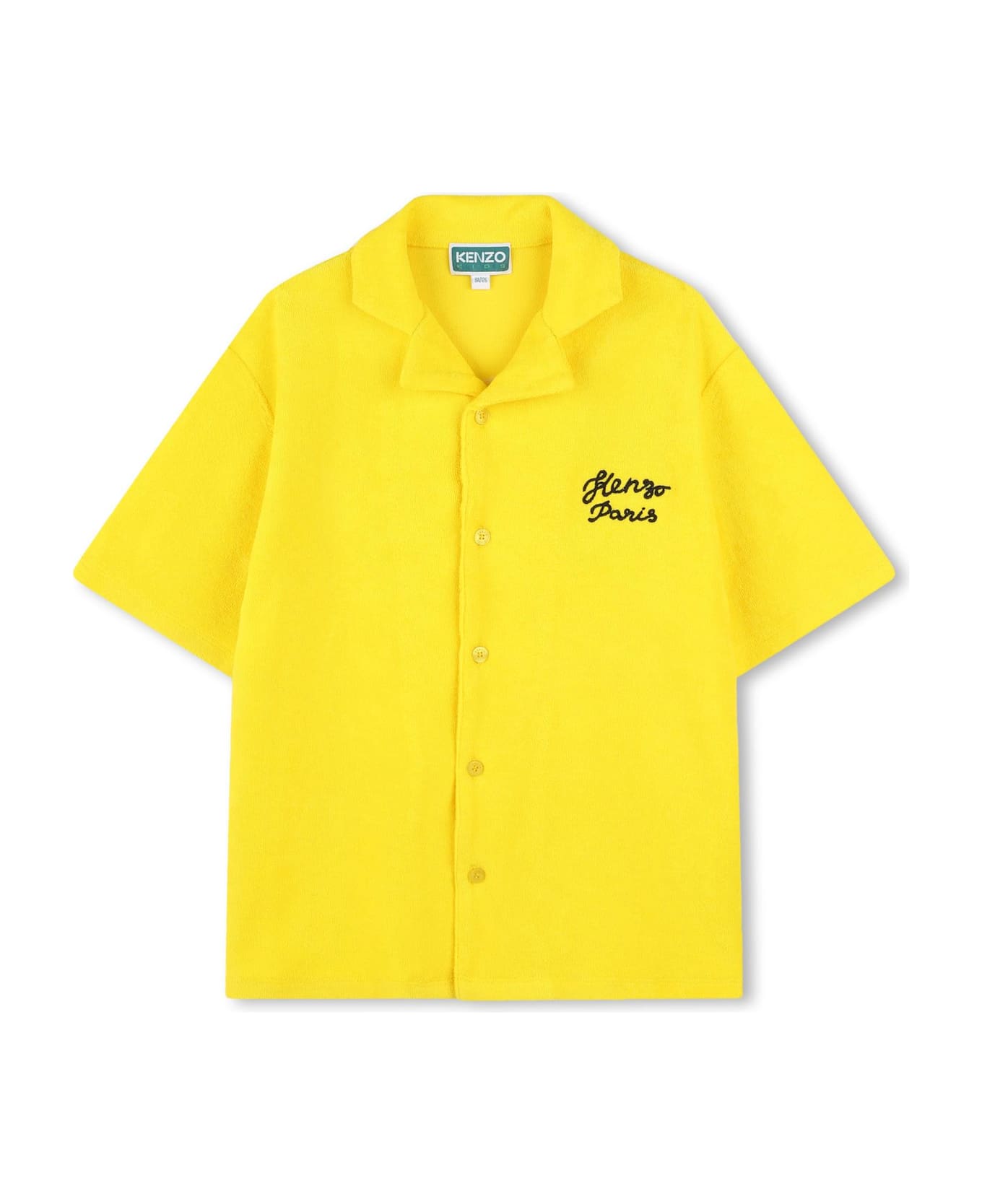 giallo banana cotone biologico effetto spugna logo sul petto chiusura frontale con abbottonatura colletto alla cubana maniche corte logo sul retro orlo dritto