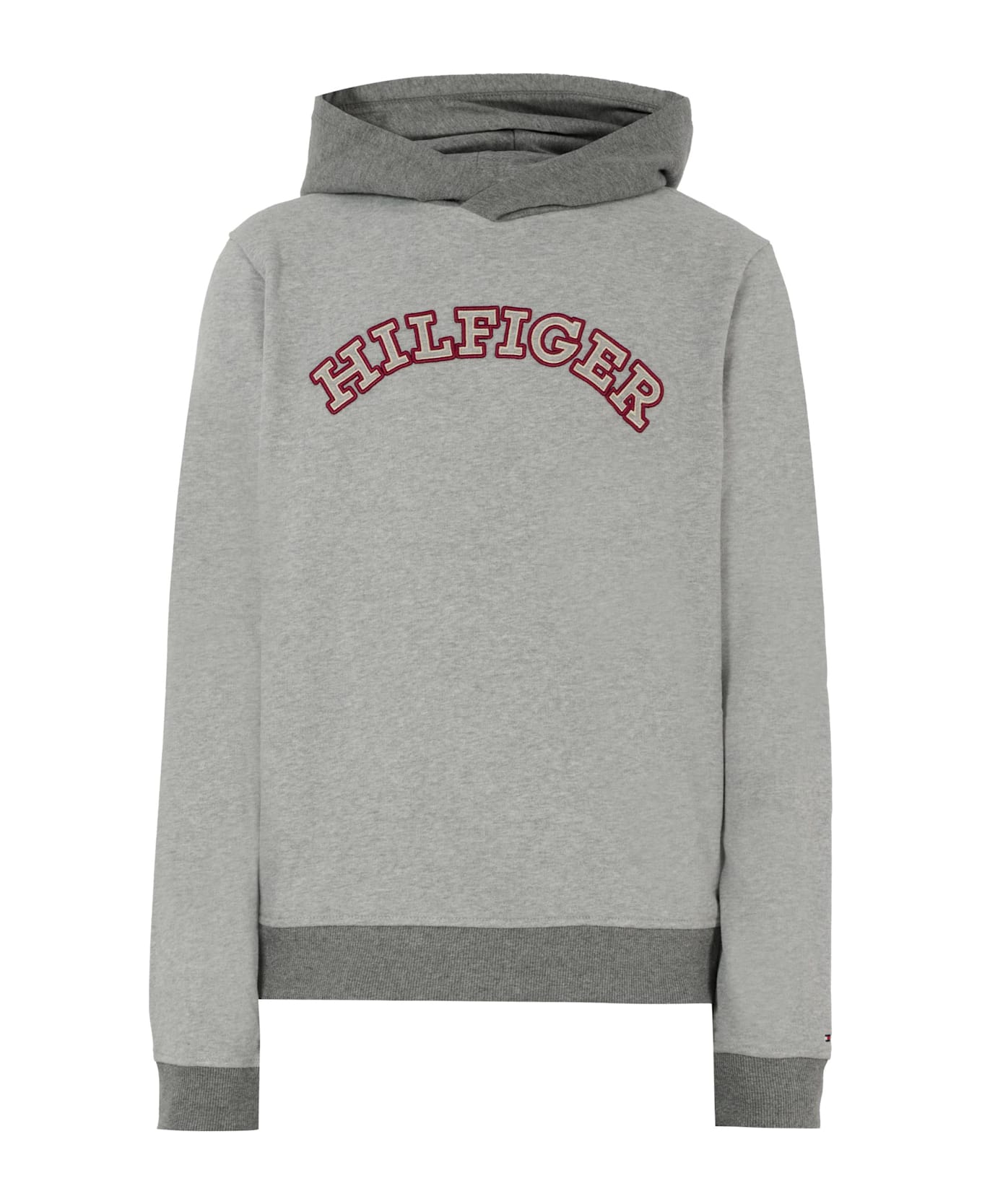 Grey sweatshirt in cotton blend, lightly brushed, with long sleeves, hood, cuffs and hem in ribbed fabric. It is embellished with an embroidered logo on the front and an iconic embroidered flag on the chest.