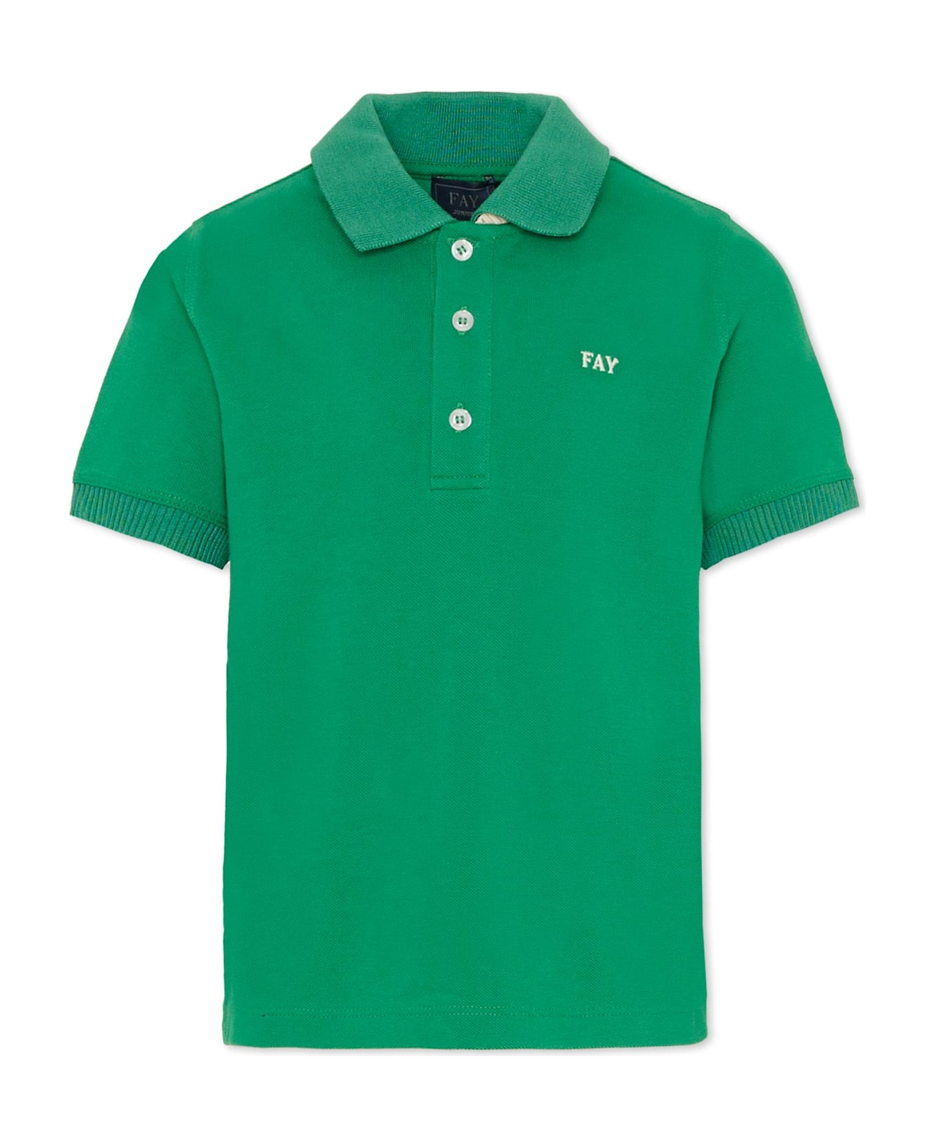 Green cotton piqué polo shirt with short ribbed sleeves, a point collar, and a front button closure. It is embellished with an embroidered logo on the chest.