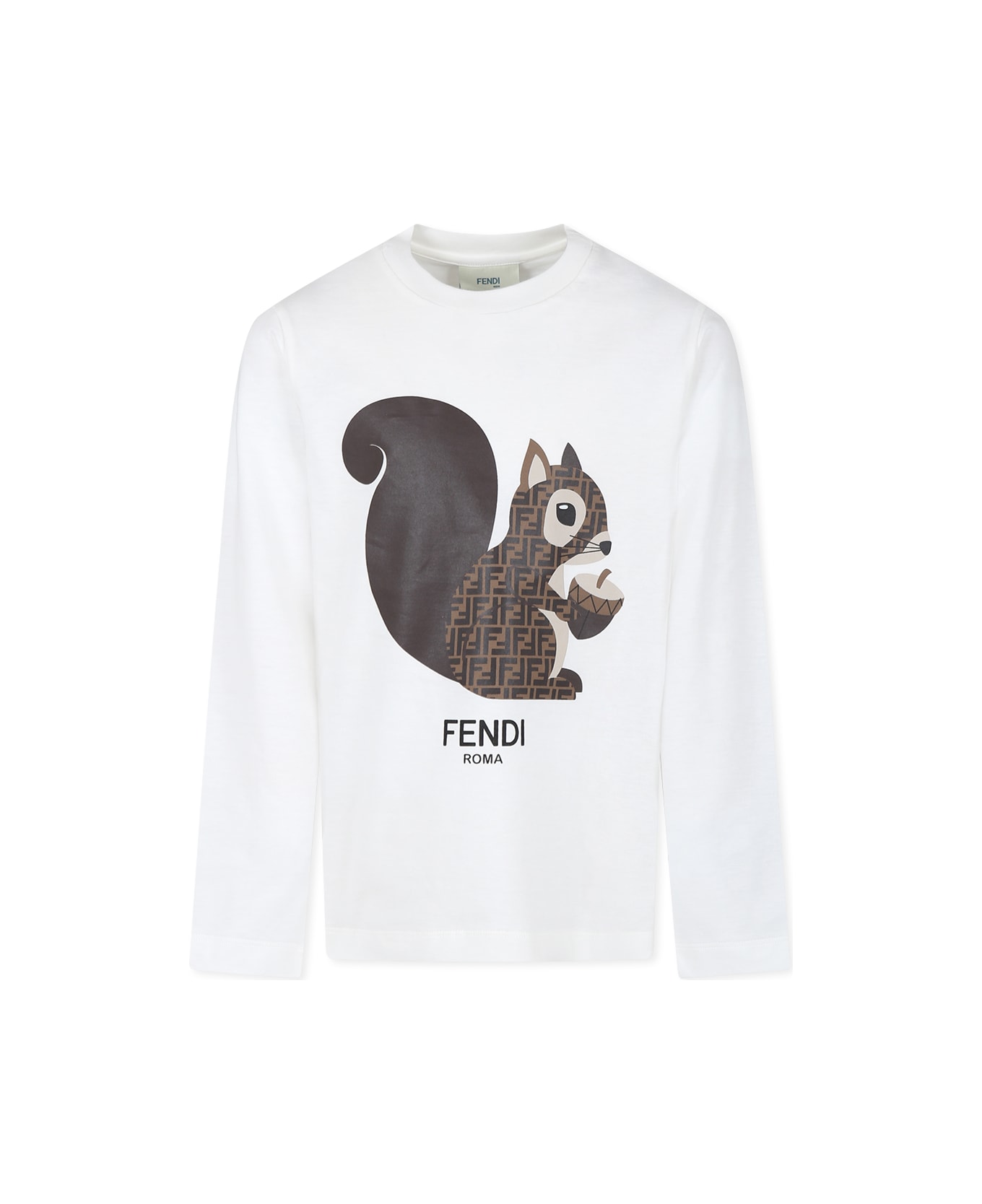 White t-shirt from the luxury Italian brand Fendi Kids, made of soft cotton jersey. This t-shirt features long sleeves and a ribbed crewneck. It is embellished with a squirrel with iconic FF tobacco and Fendi logo, on the front.