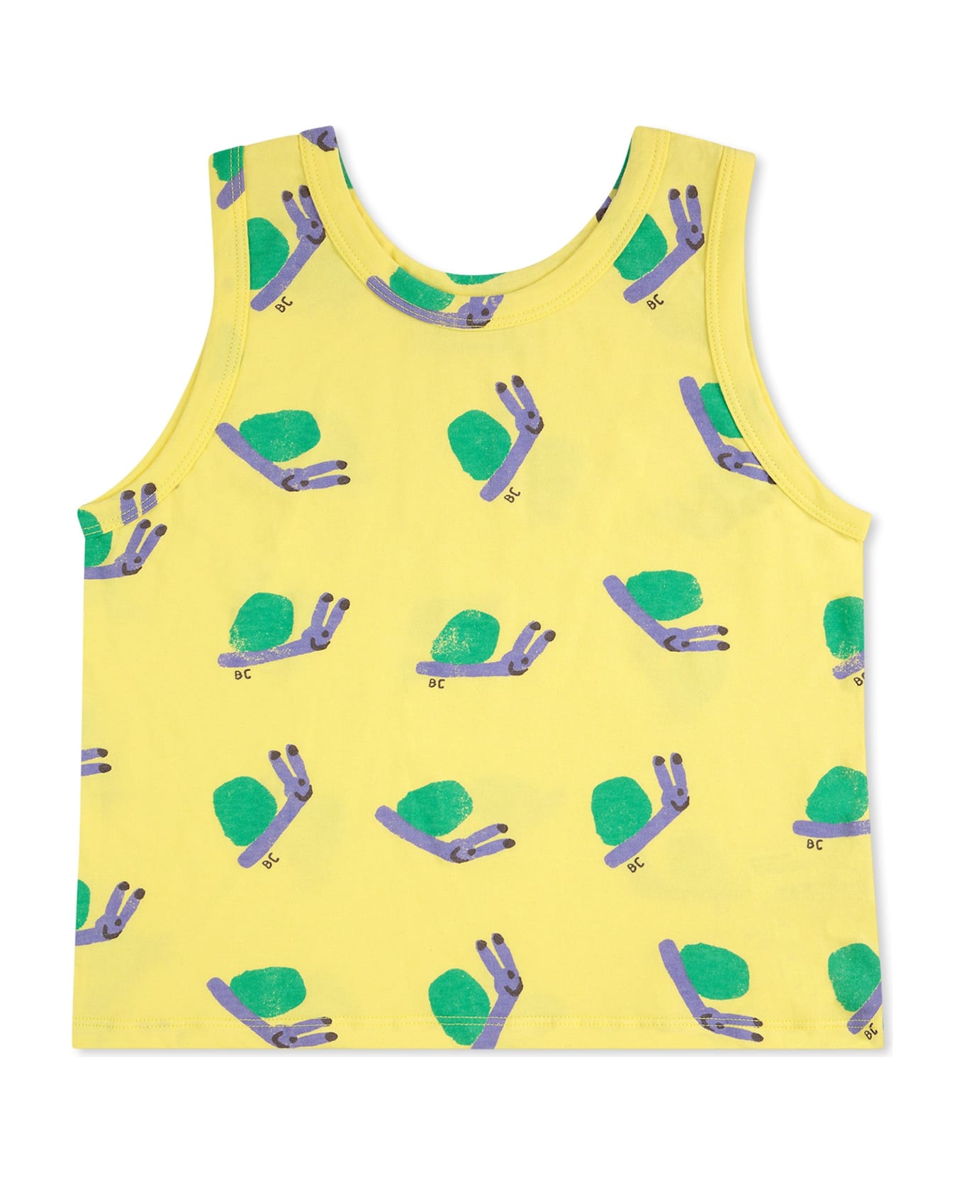 Yellow organic cotton tank top with round neckline. It is embellished with an all-over snail print.