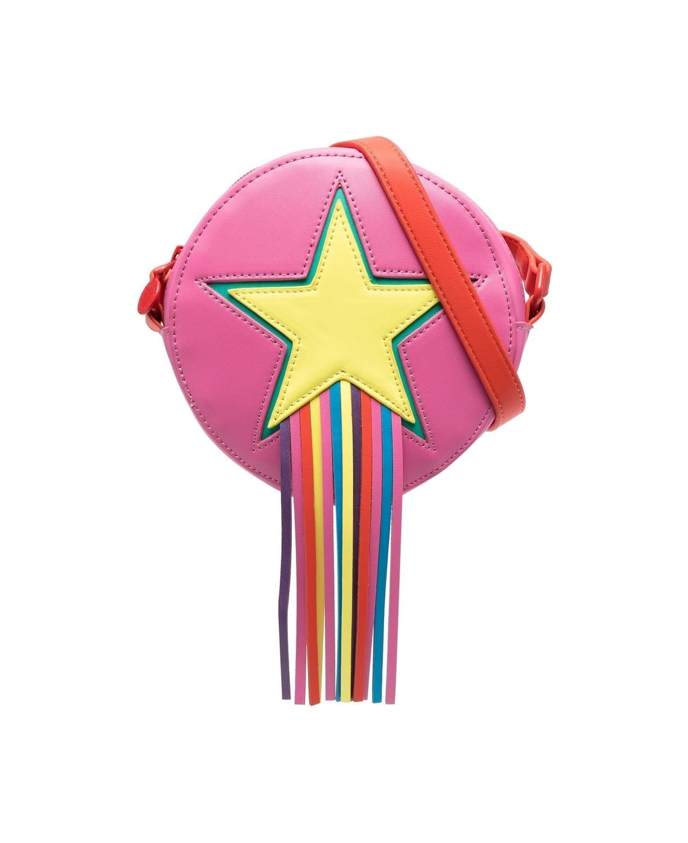 Stella McCartney Kids shoulder bag made of chewing gum pink synthetic leather with round shape, contrasting star patch and multicolor fringes on the front. Zip closure.