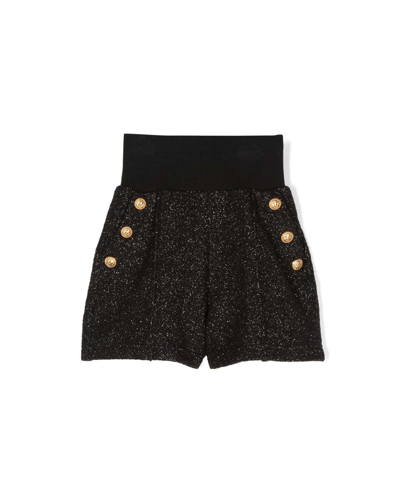 Black shorts by Balmain Kids made from a wool blend with all-over gold glitter and gold embossed buttons applied to the front. The garment features an elasticated waist, two side pockets, a wide leg and a flared design.