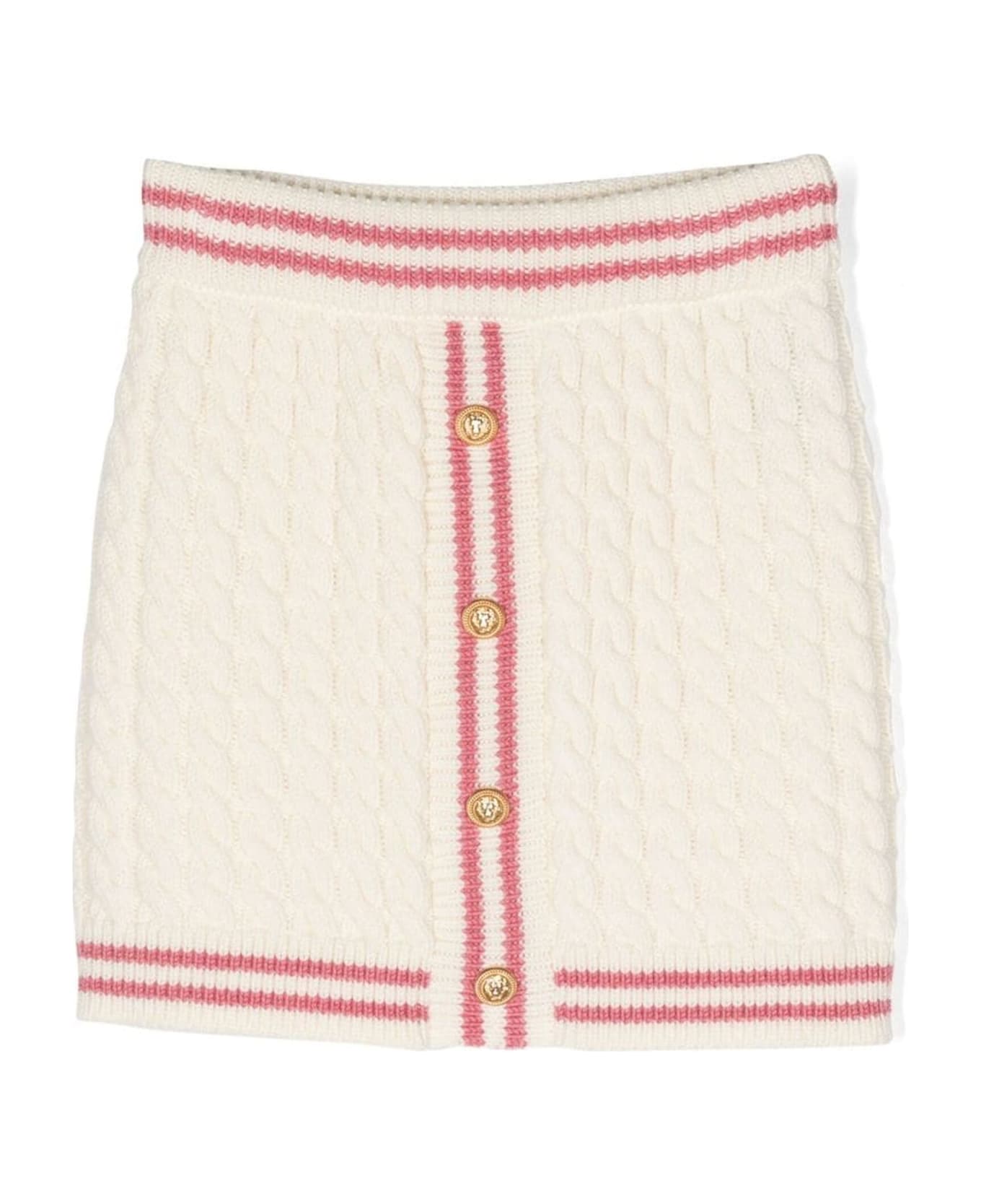 Cream white virgin wool mini skirt, knitted construction, cable knit, ribbed waistband, striped edge, embossed gold-tone buttons, ribbed hem, straight hem, thigh-length Composition: Virgin Wool, 100%