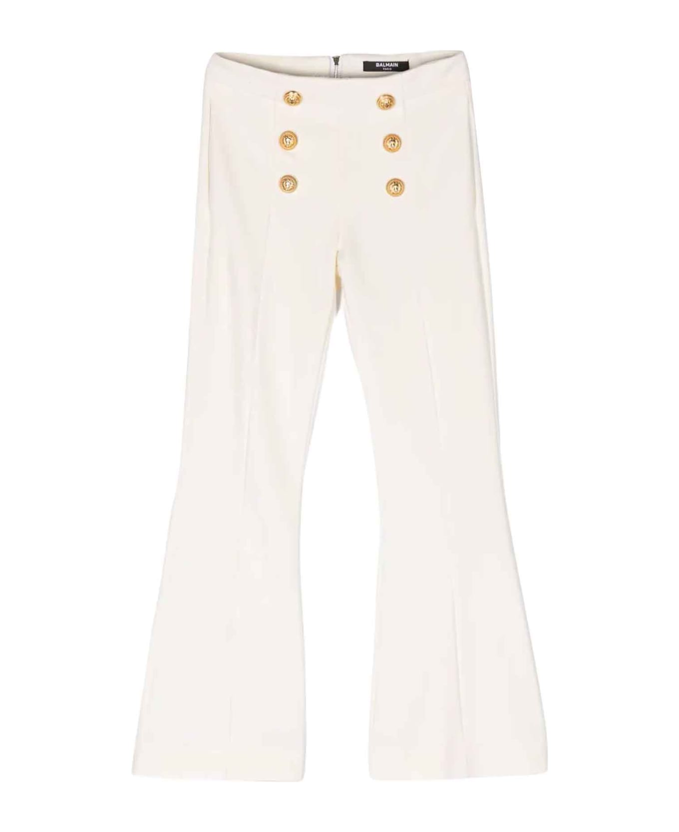 Ivory trousers girl. Embossed gold-tone buttons, decorative button detail, ironed crease, mid rise, back zip fastening, flared hem and two side welt pockets. Viscose 68%, Polyamide 28%, Spandex/Elastane 4%