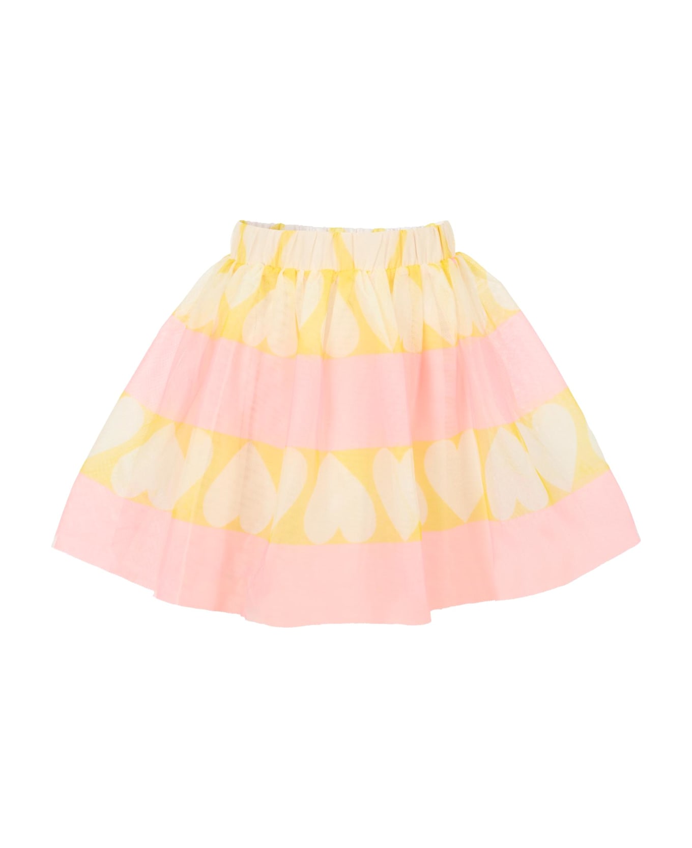 Pink tulle skirt with elastic waist. It is embellished with hearts.