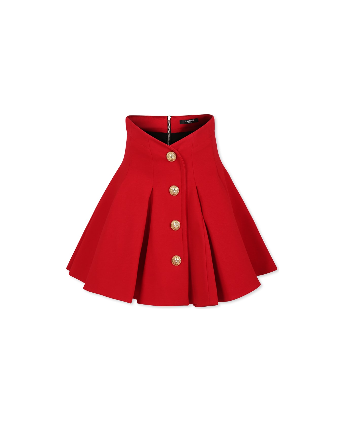 Red pleated skirt, with zip closure on the back and tulle underskirt. It is embellished with iconic gold buttons on the front.