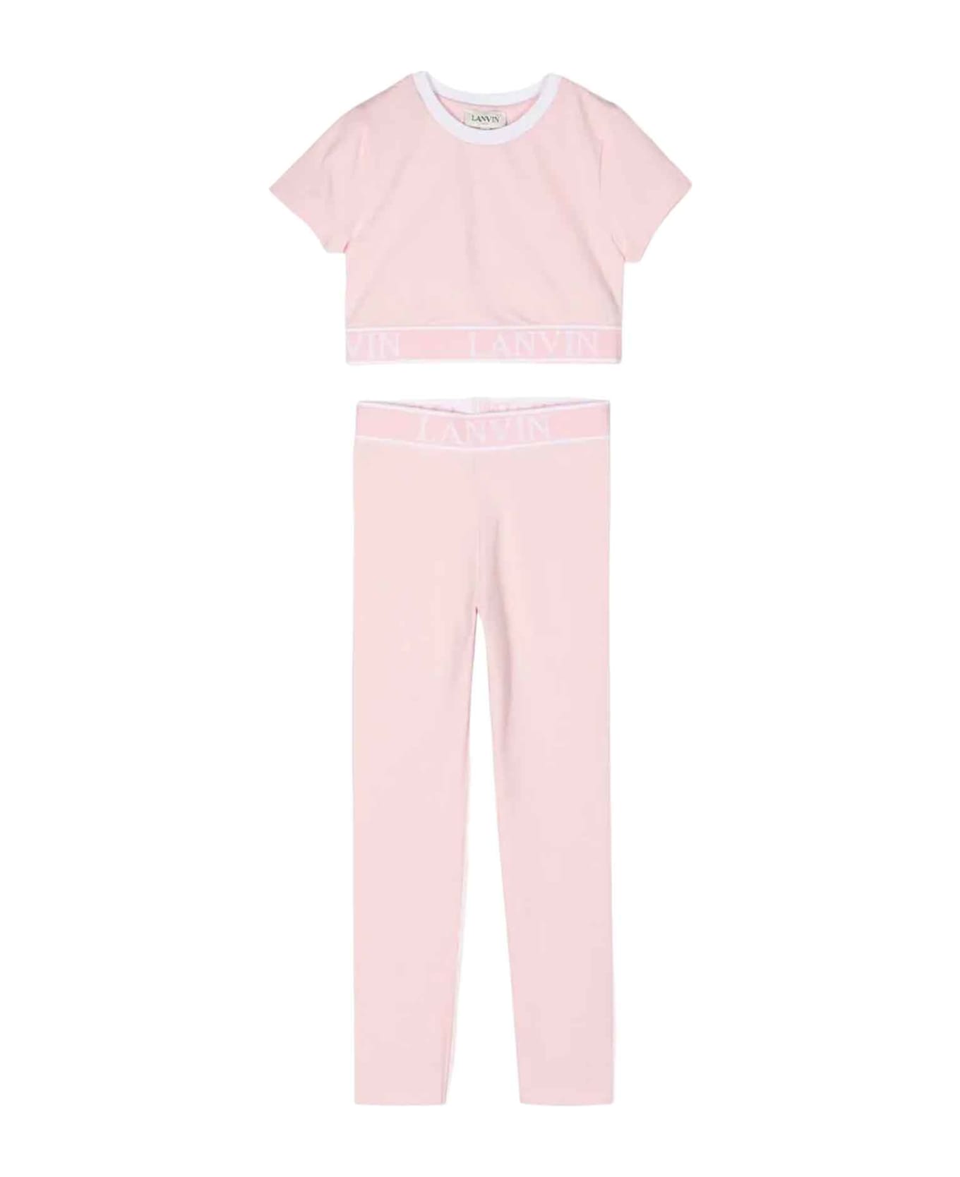 Pink jumpsuit girl. Crew neck, short sleeves, logo waist, cropped design, logo waist, stretch design and straight cut. Cotton 87%, Elastane 13%