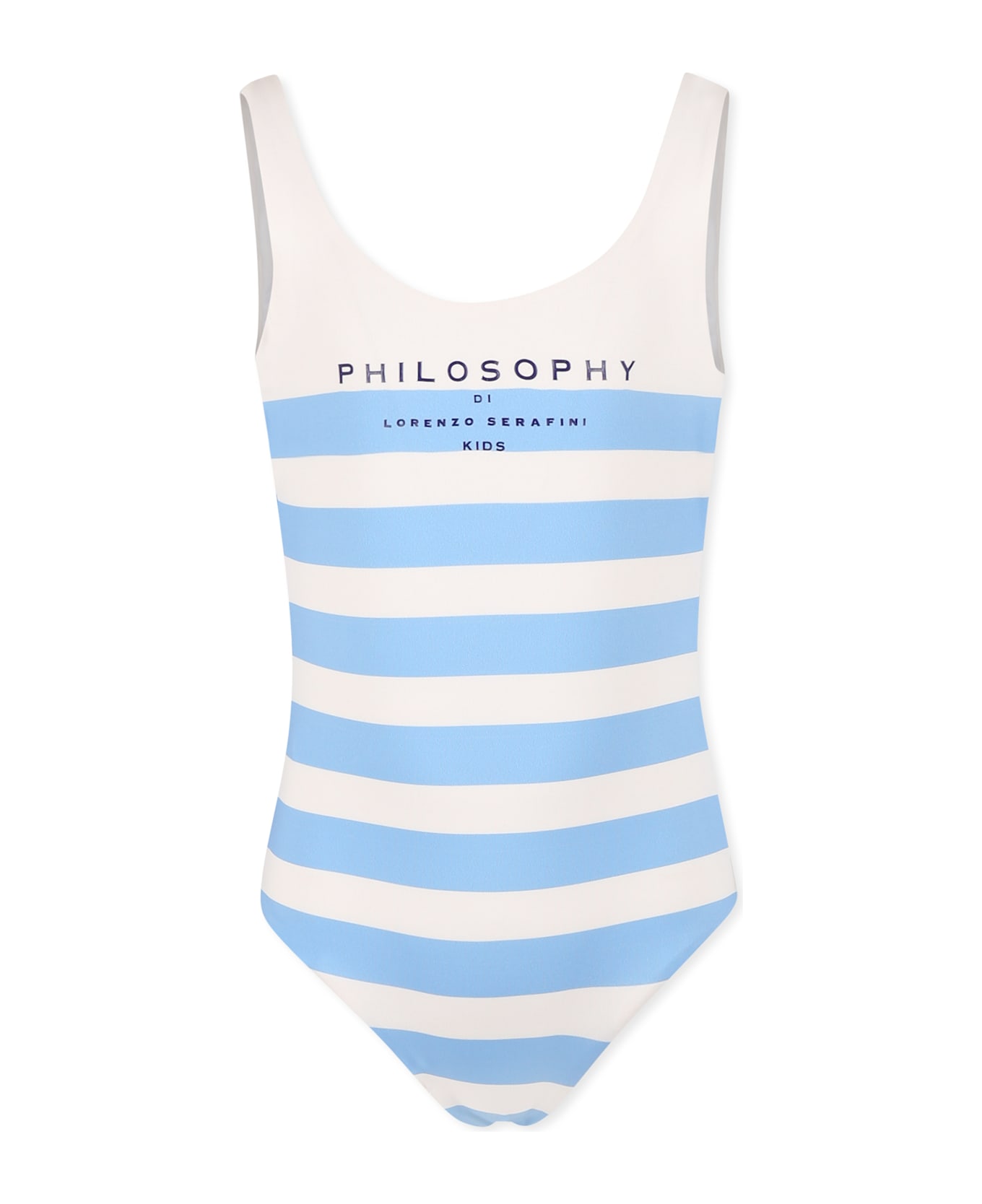 Light blue striped swimsuit with shoulder straps, adjustable buckle and back neckline. It is embellished with front logo.