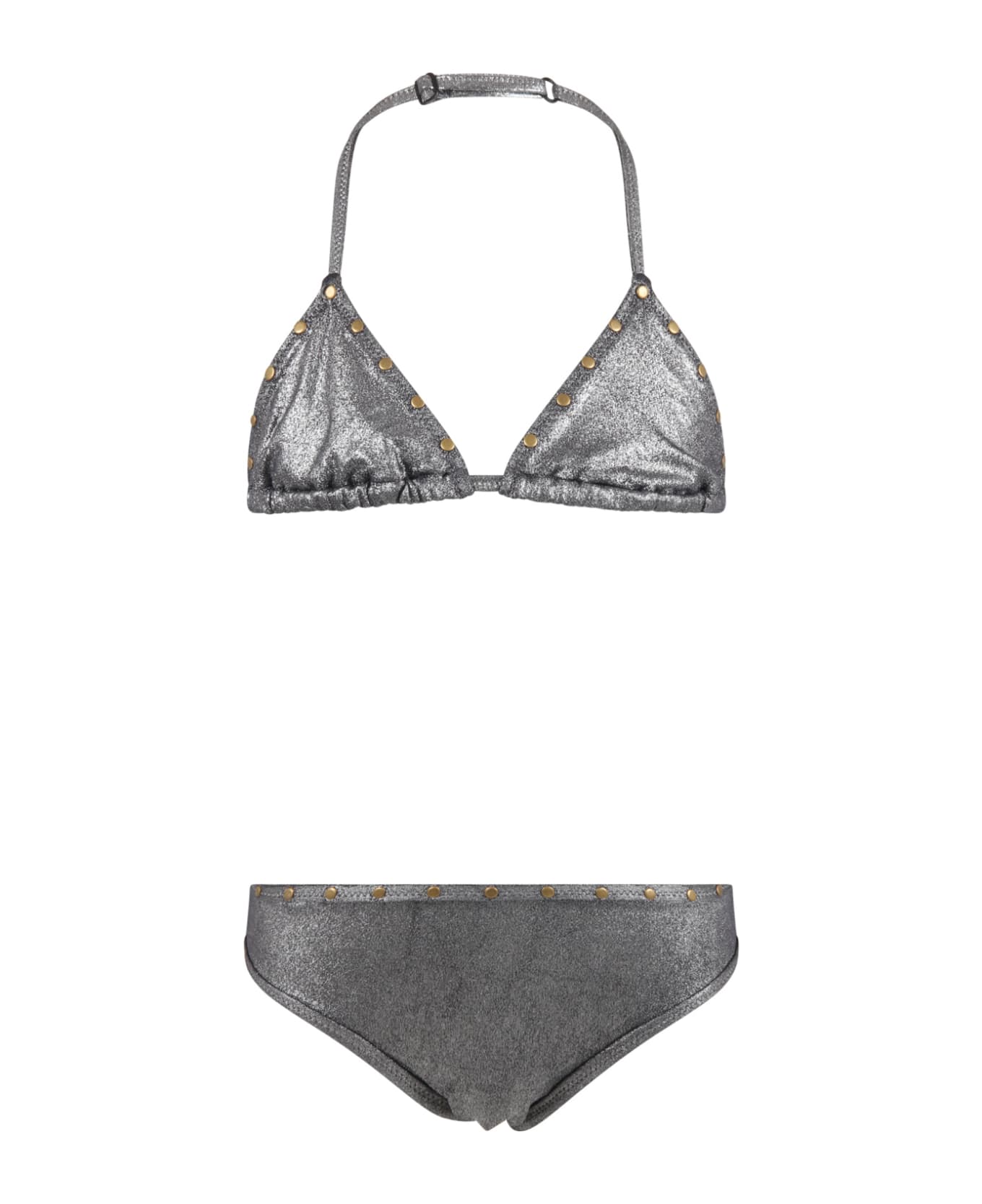Silver bikini, embellished with studs, on the front and logo, on the back briefs.