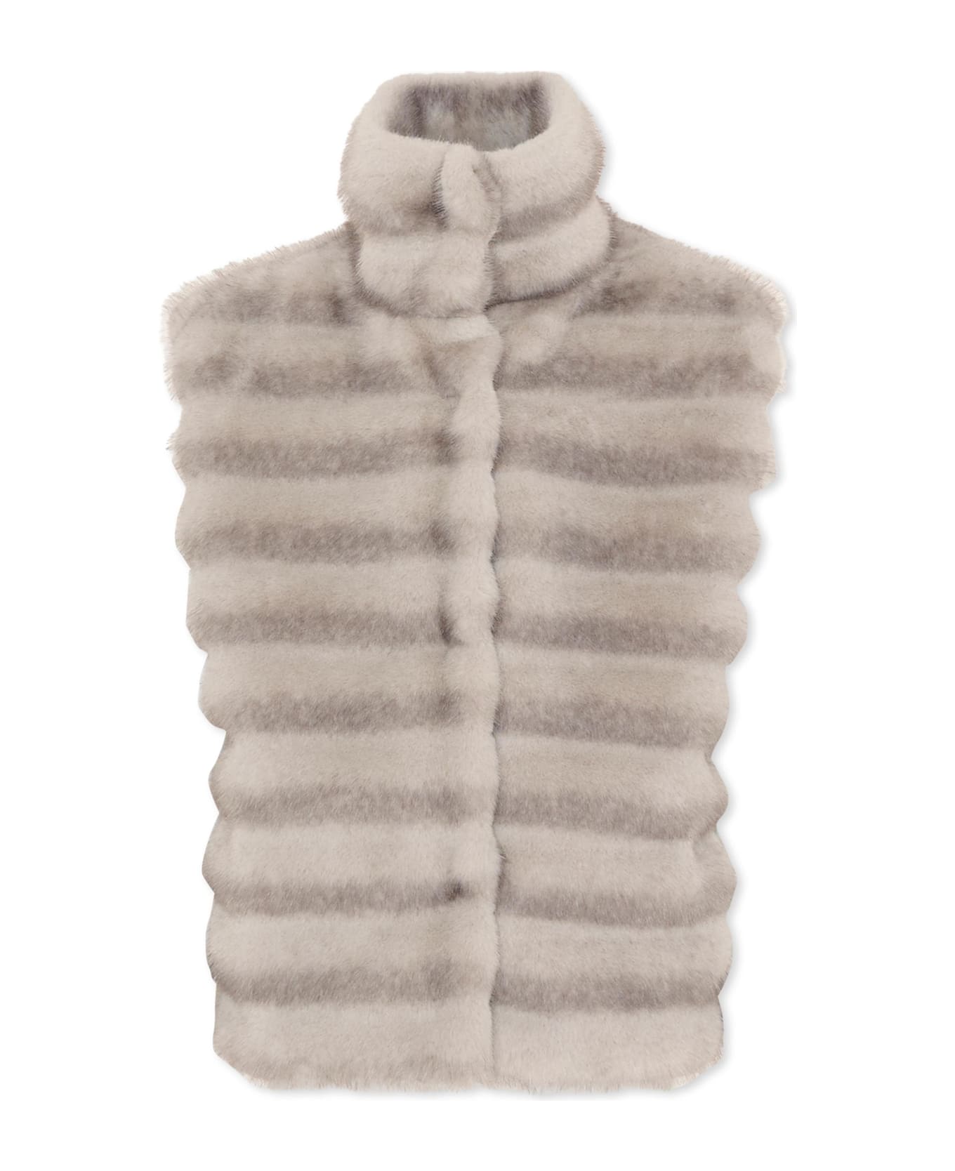 Grey faux fur vest with high collar, front fastening with snap buttons and side pockets.