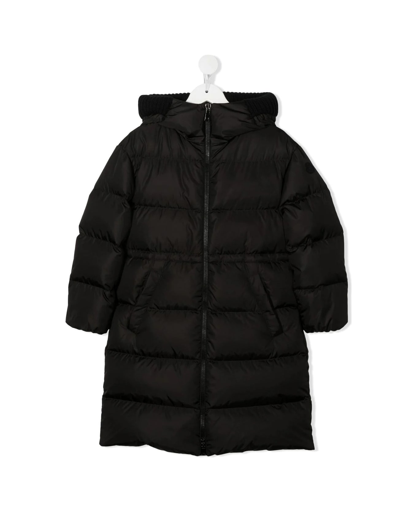 Chalain long down jacket for girls signed Moncler Enfant made of black nylon technique and characterized by nylon lining, down padding, long sleeves, two side pockets, hood with knitted edge, embroidered brand lettering, tone-on-tone felt logo, closure front with double slider zip and adjustable waist belt that defines the silhouette.