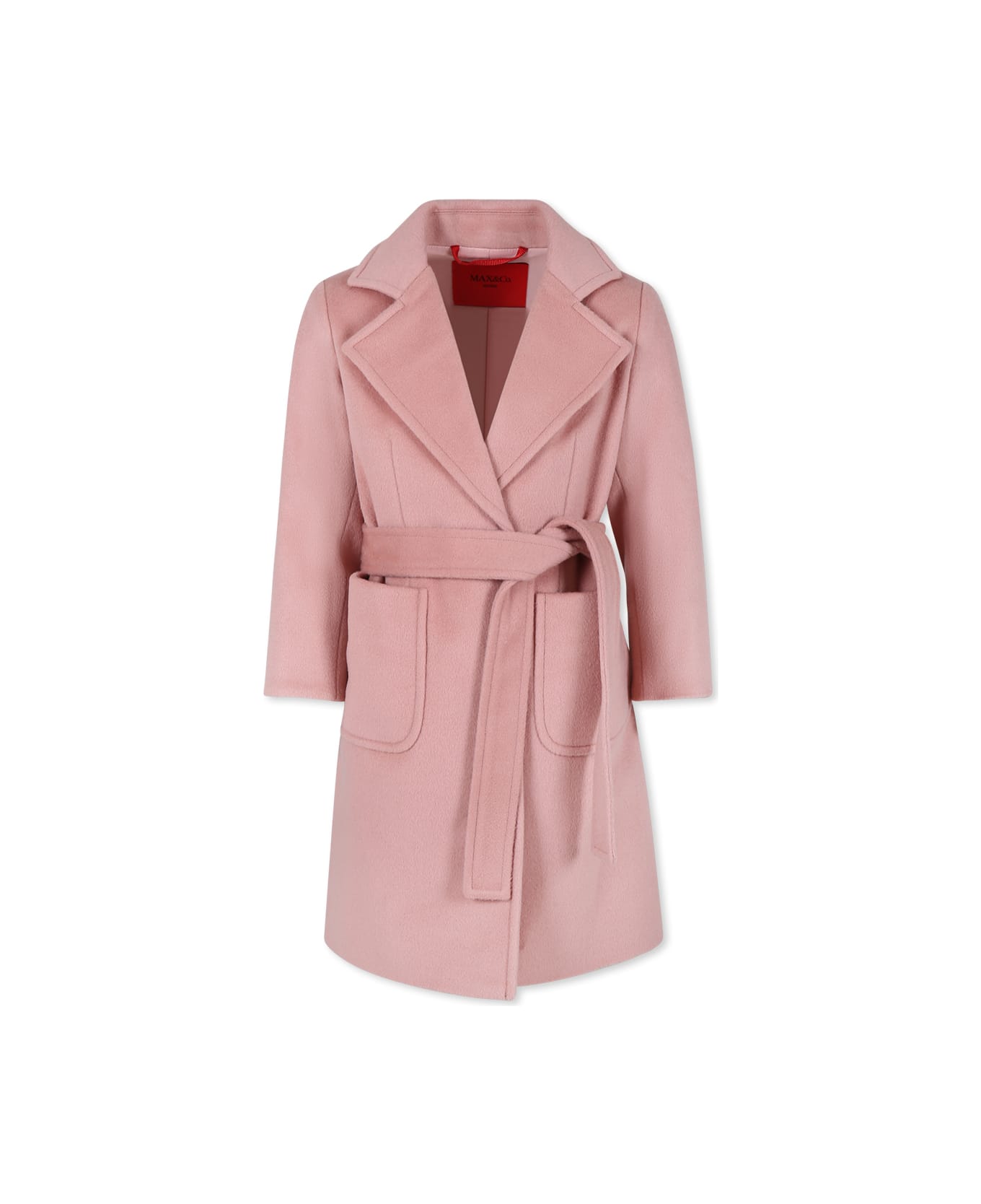 Pink wool coat, long sleeves, with lapel collar, front button fastening, belt at the waist, patch pockets on the front and slits on the back.
