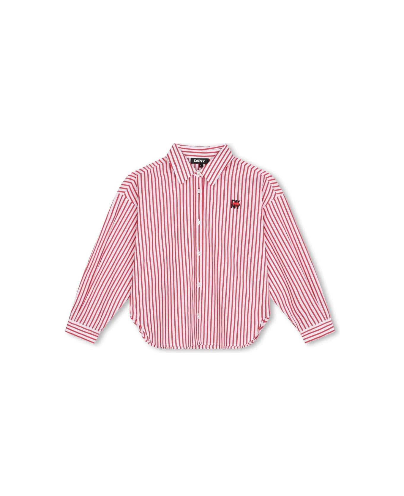 Dkny kids white/red girl shirt. Poplin weave, vertical striped print, spread collar, front button closure, long sleeves, buttoned hems and curved hem. 100% organic cotton
