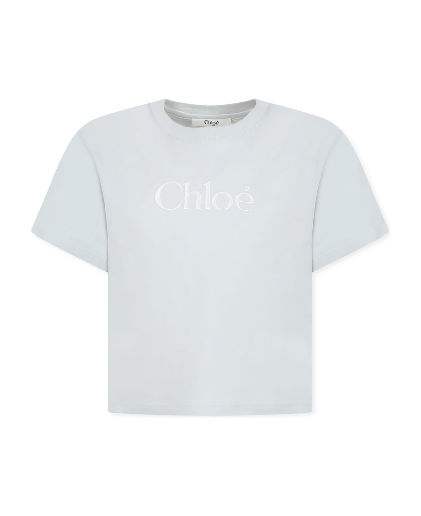 Green t-shirt from the French brand Chloé Kids, made of organic cotton jersey, with short sleeves and a ribbed crew neck. It is embellished with white logo embroidered on the front.