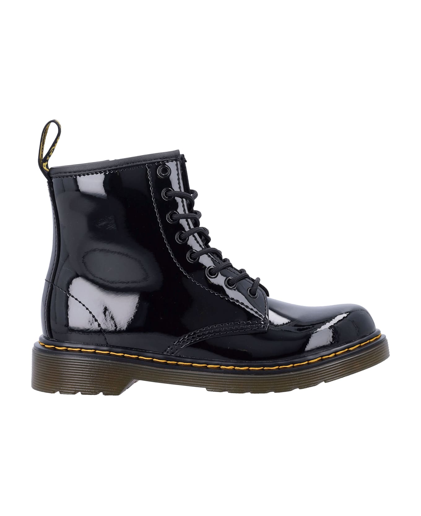 Bold And Timeless, These Dr. Martens 1460 J Boots Are Crafted In Black Patent Leather With A Round Toe And Lace-up Fastening Featuring Eight Tonal Metal Eyelets. A Side Zip Adds Practicality, While Contrast Yellow Stitching And A Branded Heel Pull Tab Complete The Design. The Flexible Pvc Sole With Air-cushioning Ensures Comfort And Durability, True To The Brand's Heritage. Black Patent Leather Boots Round Toe With Side Zip Lace-up Fastening With 8 Eyelets Branded Heel Pull Tab With Yellow Stitching Flexible Pvc Sole With Air-cushioning