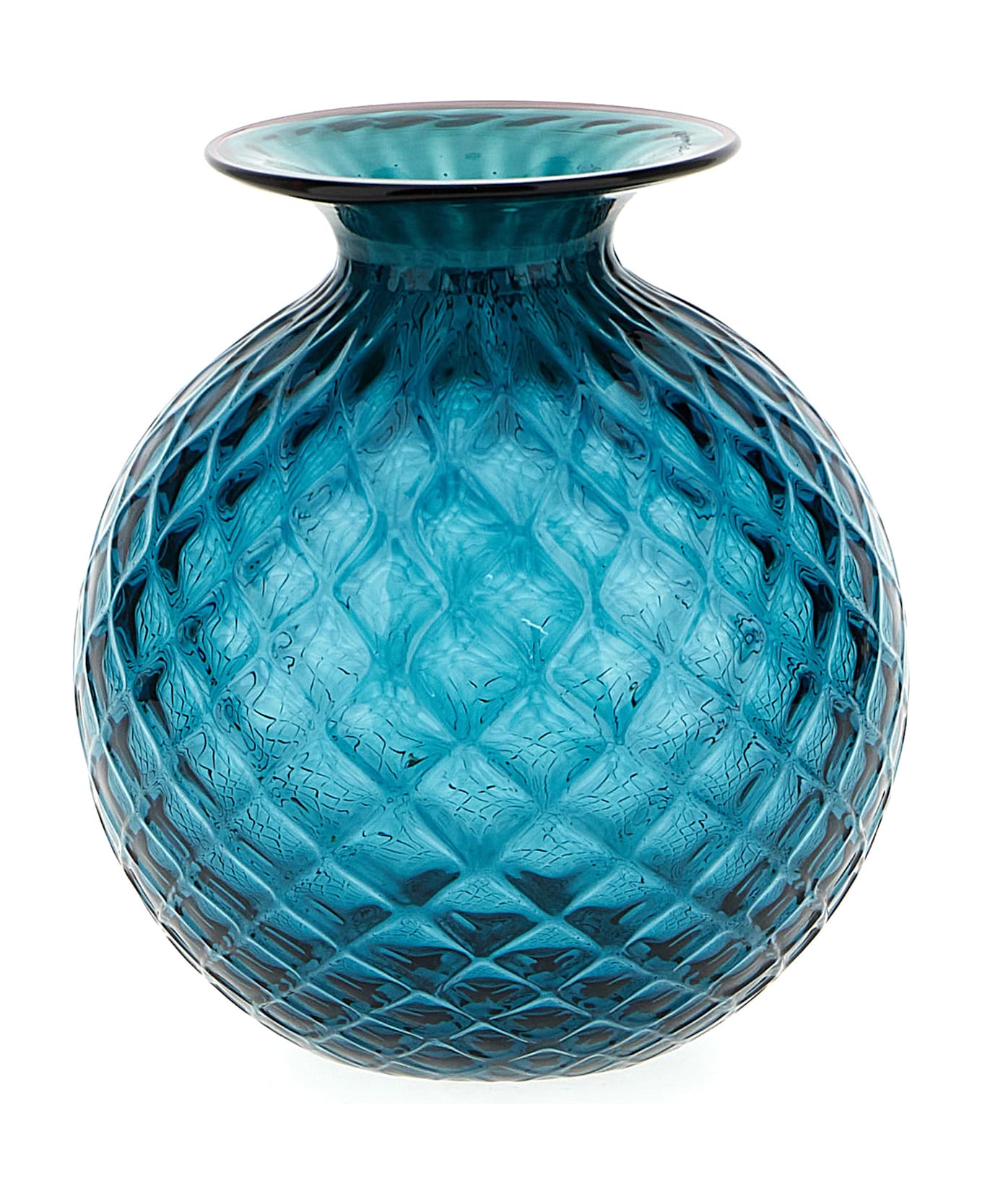 It looks soft, yet it is glass. The optical illusion of the VENINI Monofiori of 1970 is in its name: Balloton, the unique workmanship that recreates the matelassé effect on the surface. The work is handmade, blown into the characteristic metal mold and finished in the thin neck with a hot colored thread, which varies in color.