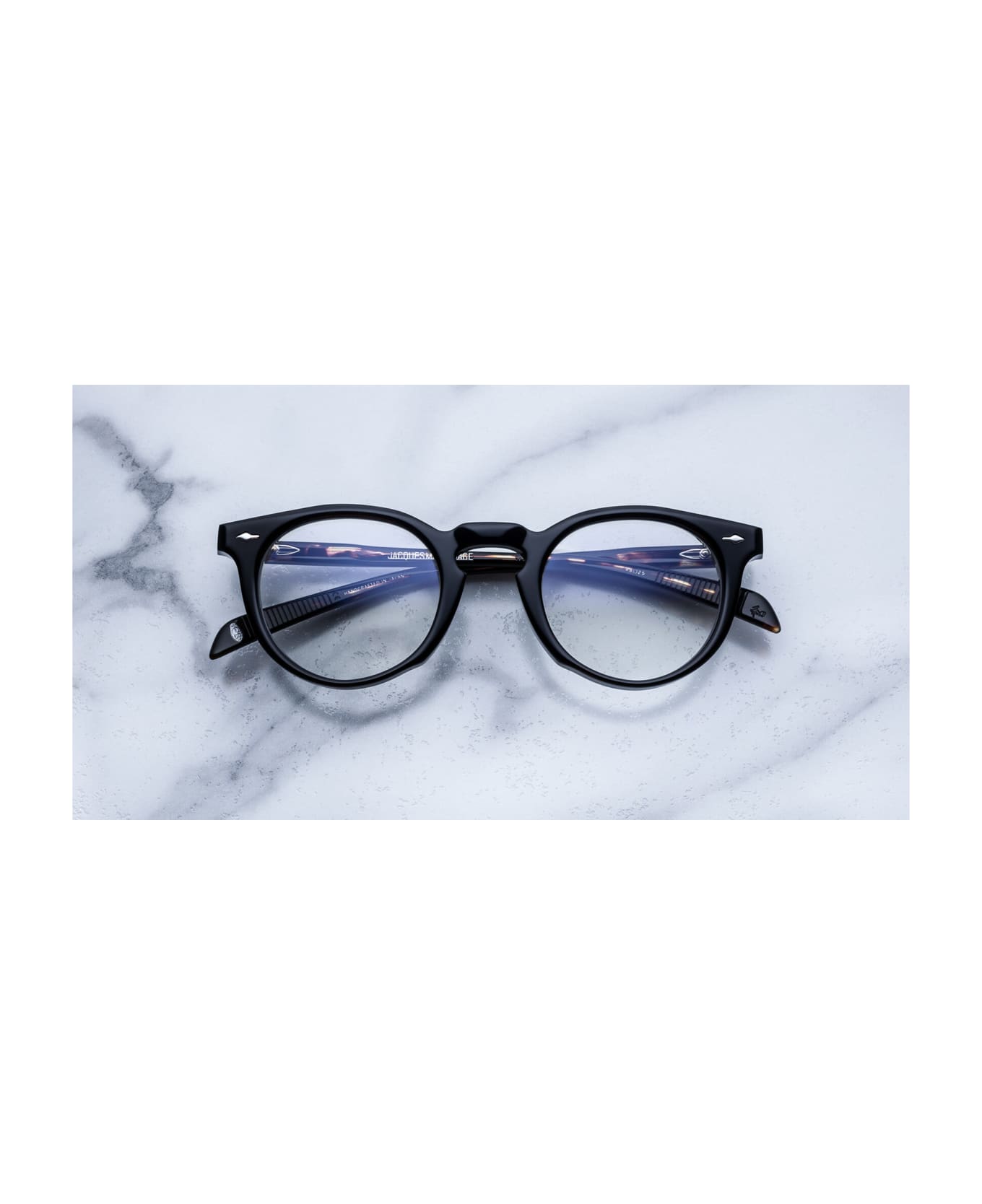 Jacques Marie Mage Percier Noir has a monoblock custom hinge system with contrasting - Color rivets and embossed hairline decoration, sterling silver signature arrowhead front pin, silver custom hairline engraved wire core design, silver tension-secured custom hinge with spur-shaped rivets, a burgundy domed 3D metal cameo logo and 6 base CR39 lens with backside anti-reflective treatment.