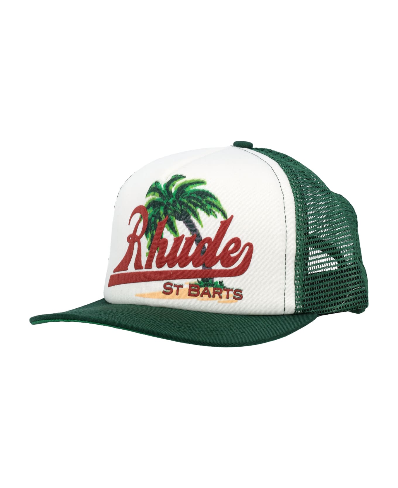 Palms Trucker Hat By Rhude. Featuring: Mesh Panels Front Logo With Graphic Print Flat Visor Adjustable Fastening At Back