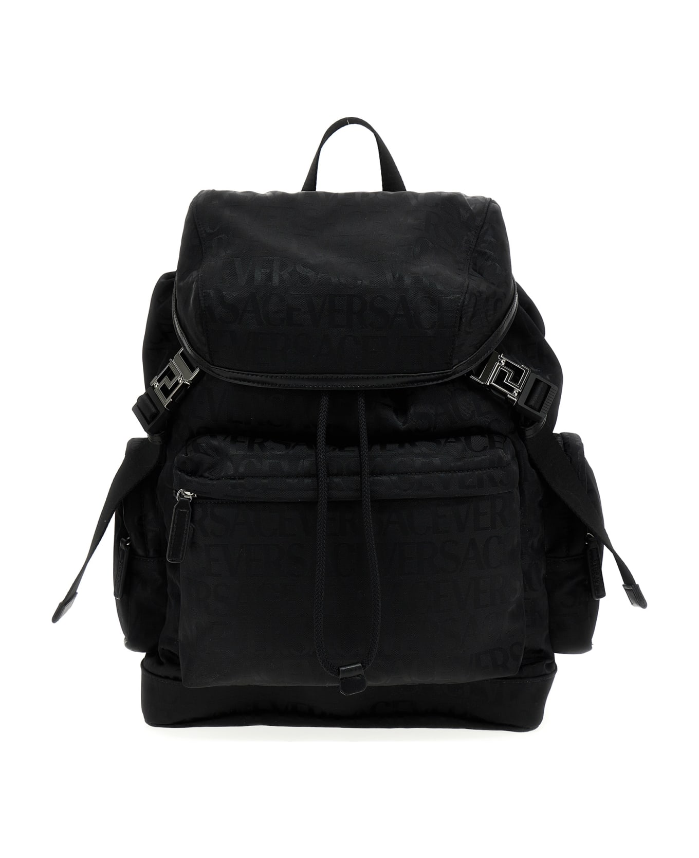 Nylon backpack with all-over jacquard logo pattern, silver leather and metal details, zip closure, adjustable shoulder straps. Composition: