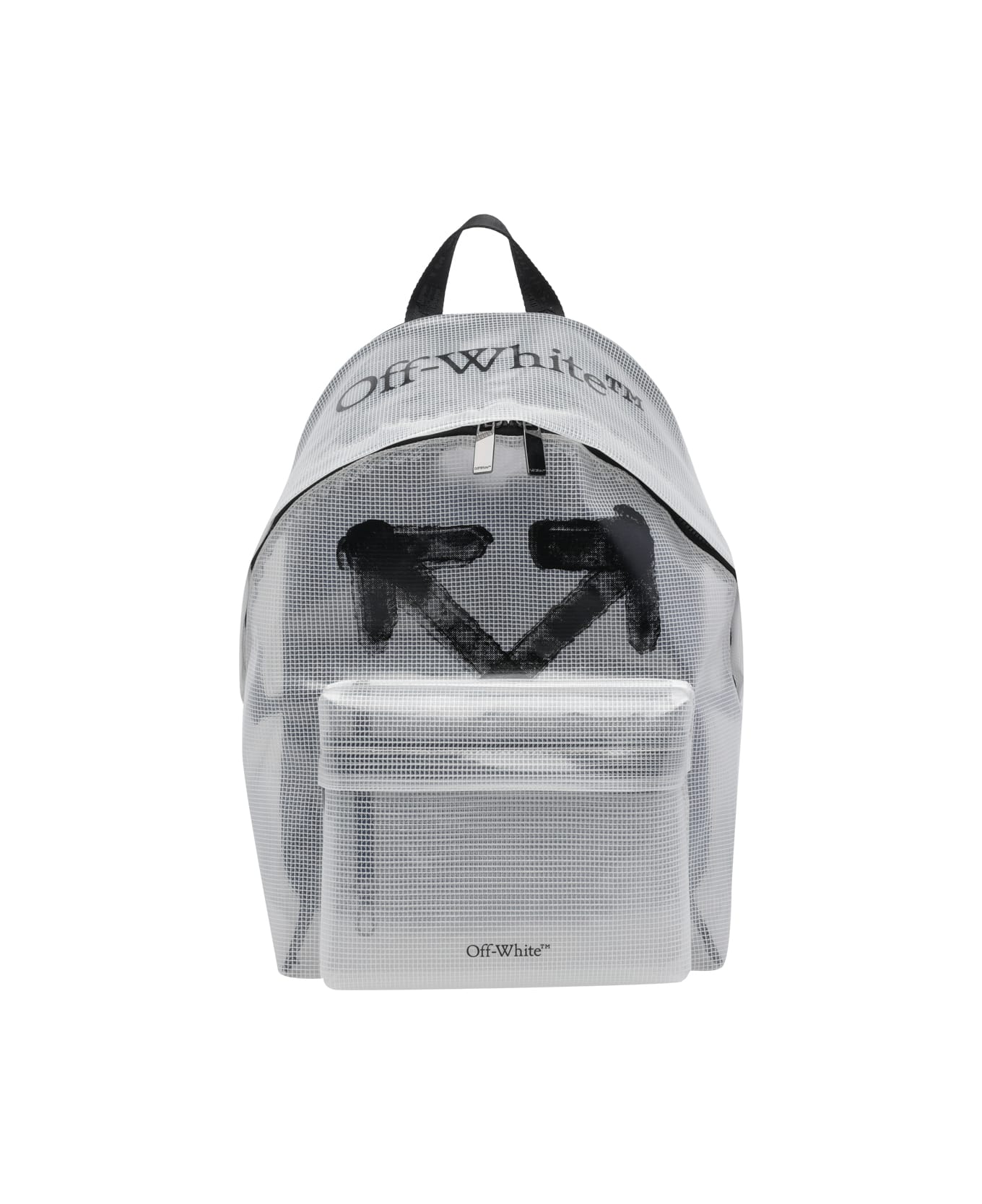Off White transparent Heritage backpack, zip closure, inner open pocket for laptop, one pocket with zip closure, one slot, external zip pocket, one handle, adjustable shoulder strap, logo