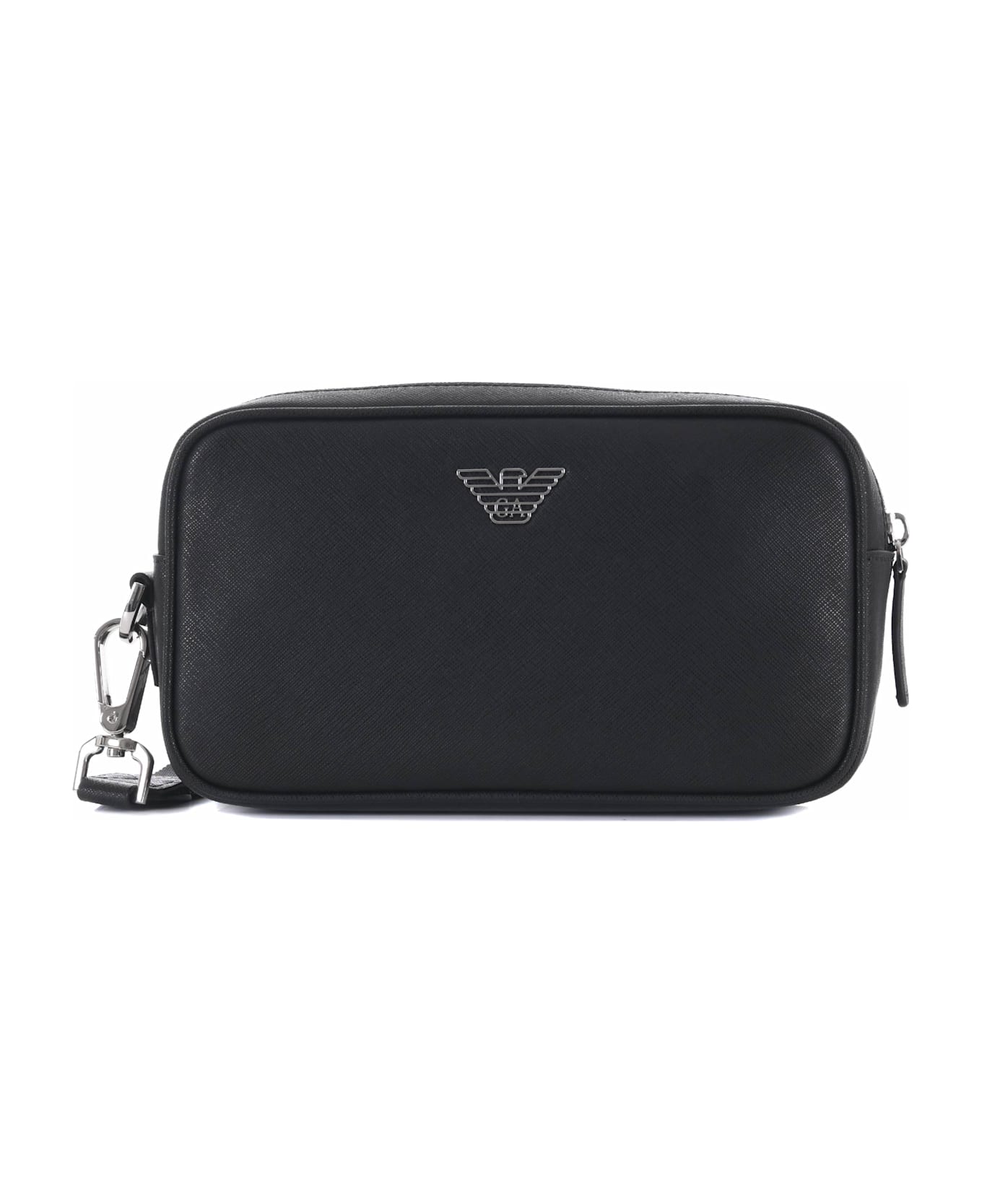 Emporio Armani clutch bag in black saffiano print eco-leather. Removable nylon handle. Back pocket with zip. Internal pockets. Zip closure. Front logo. Dimensions: height 13 cm, width 23 cm, depth 5. 5 cm. 100% polyester Composition: 100% Polyester