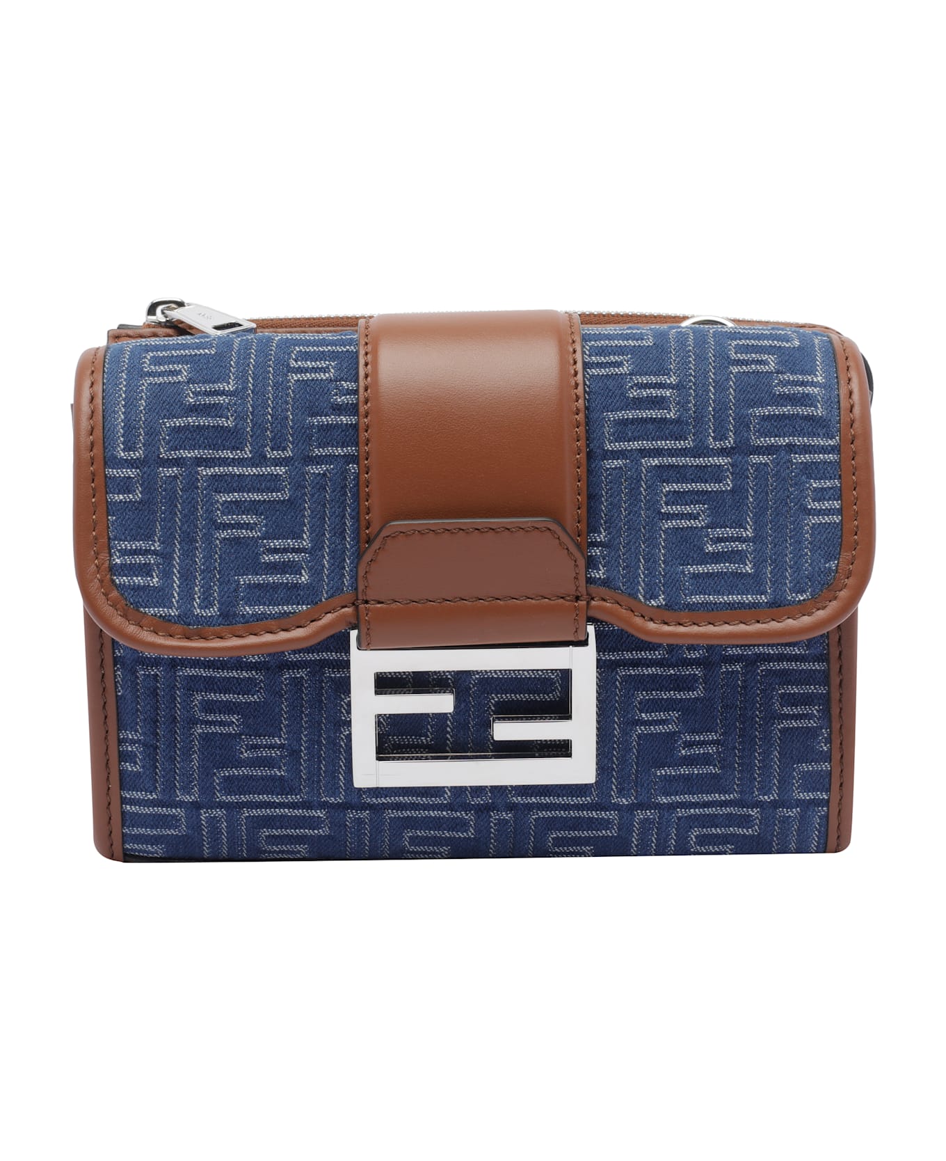 Fendi blue Baguette Double crossbody bag, 2 sections, adaptbale and removable strap, FF denim logo allover Composition: 100% Fabric, Leather Trim