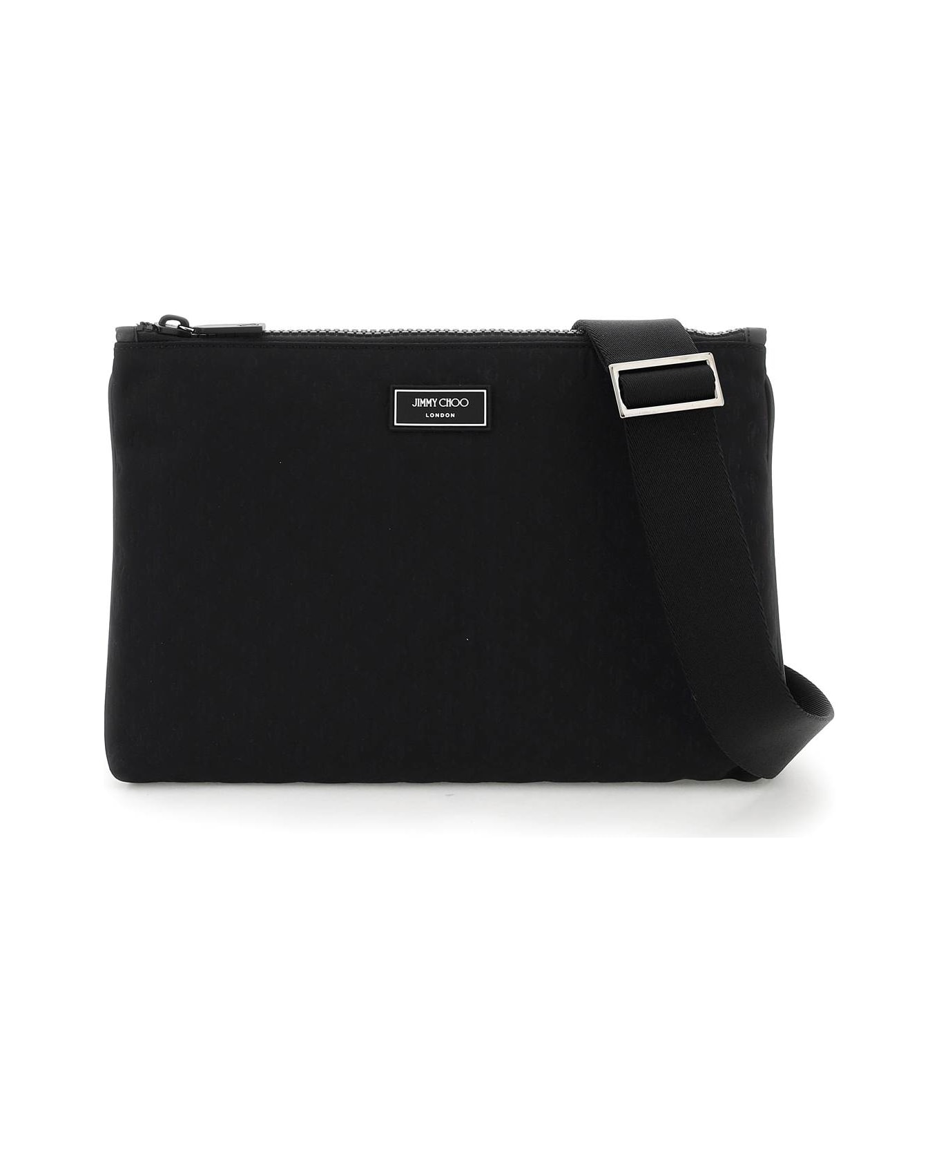 Jimmy Choo crossbody bag made of fabric with all-over embossed JC monogram. Zippered closure, lined interior with one zippered pocket, front logo patch, and adjustable, detachable fabric shoulder strap.