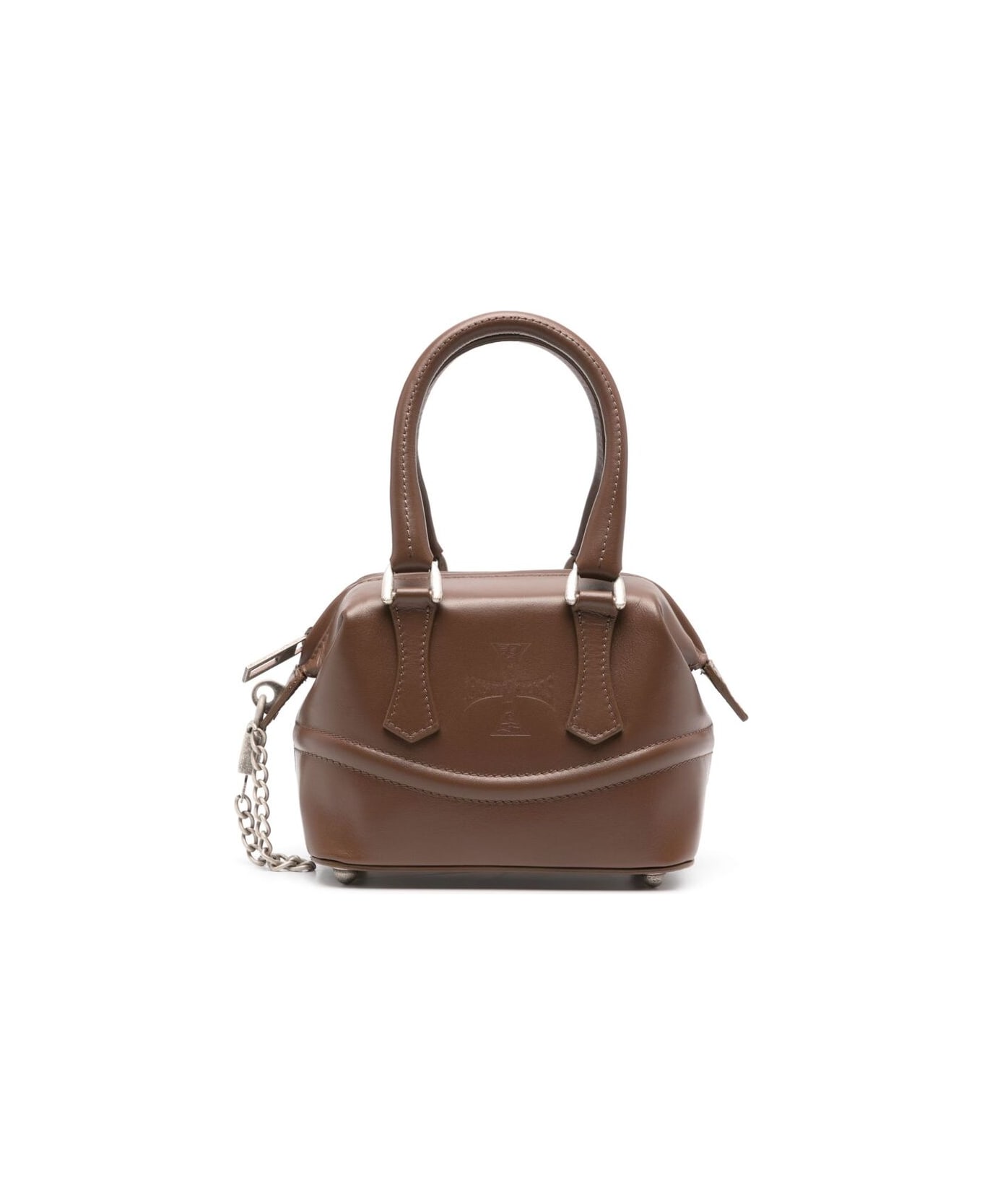 chocolate brown calf leather logo stamp to the front padlock detail top zip fastening two rolled top handles main compartment internal card slot metal feet silver-tone hardware