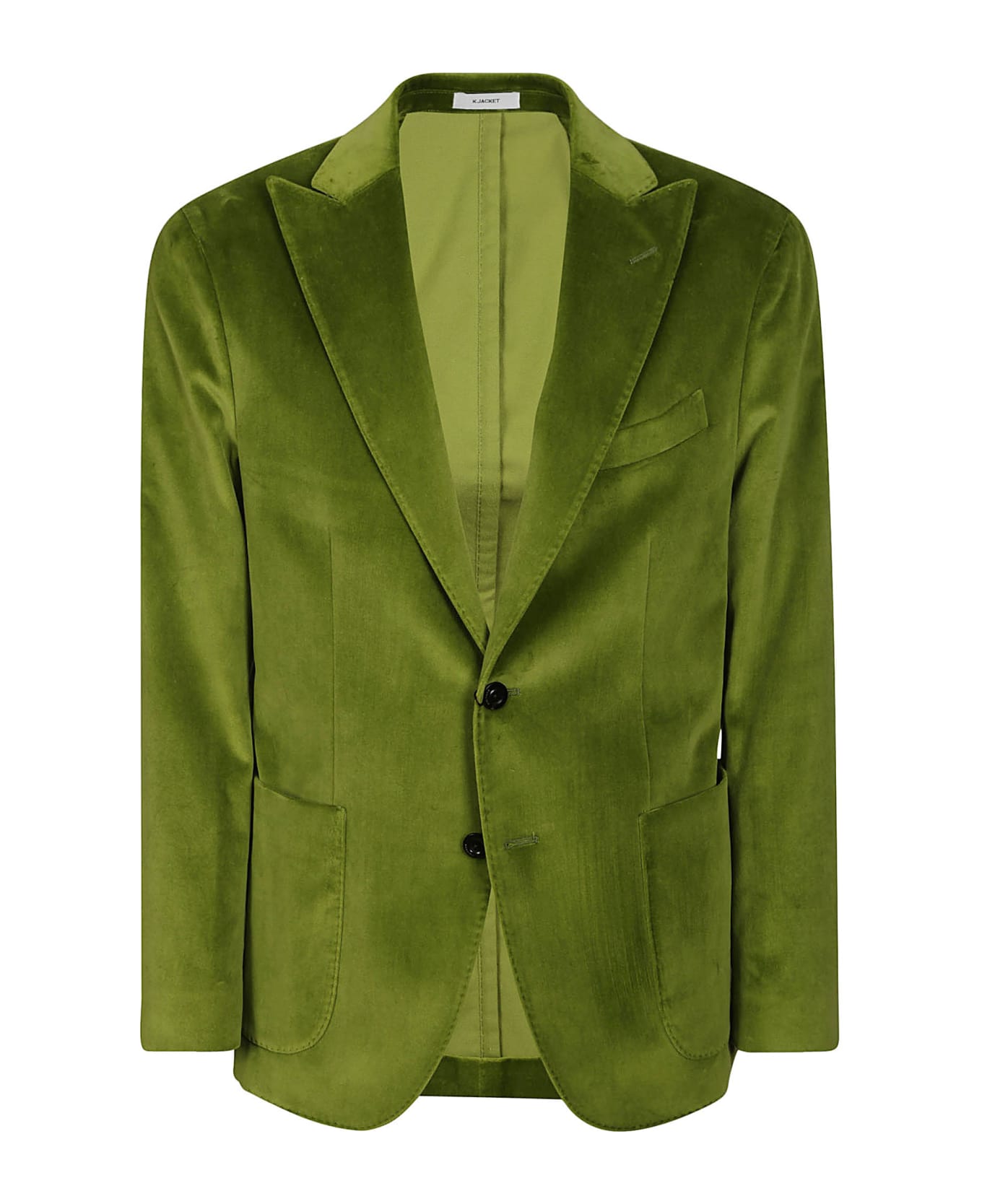 The jacket from BOGLIOLI for men is made of green cotton velvet and is unlined and deconstructed. This tailored piece is complemented by notch lapels, applied pockets, a hand-finished pocket square, and a double rear vent.