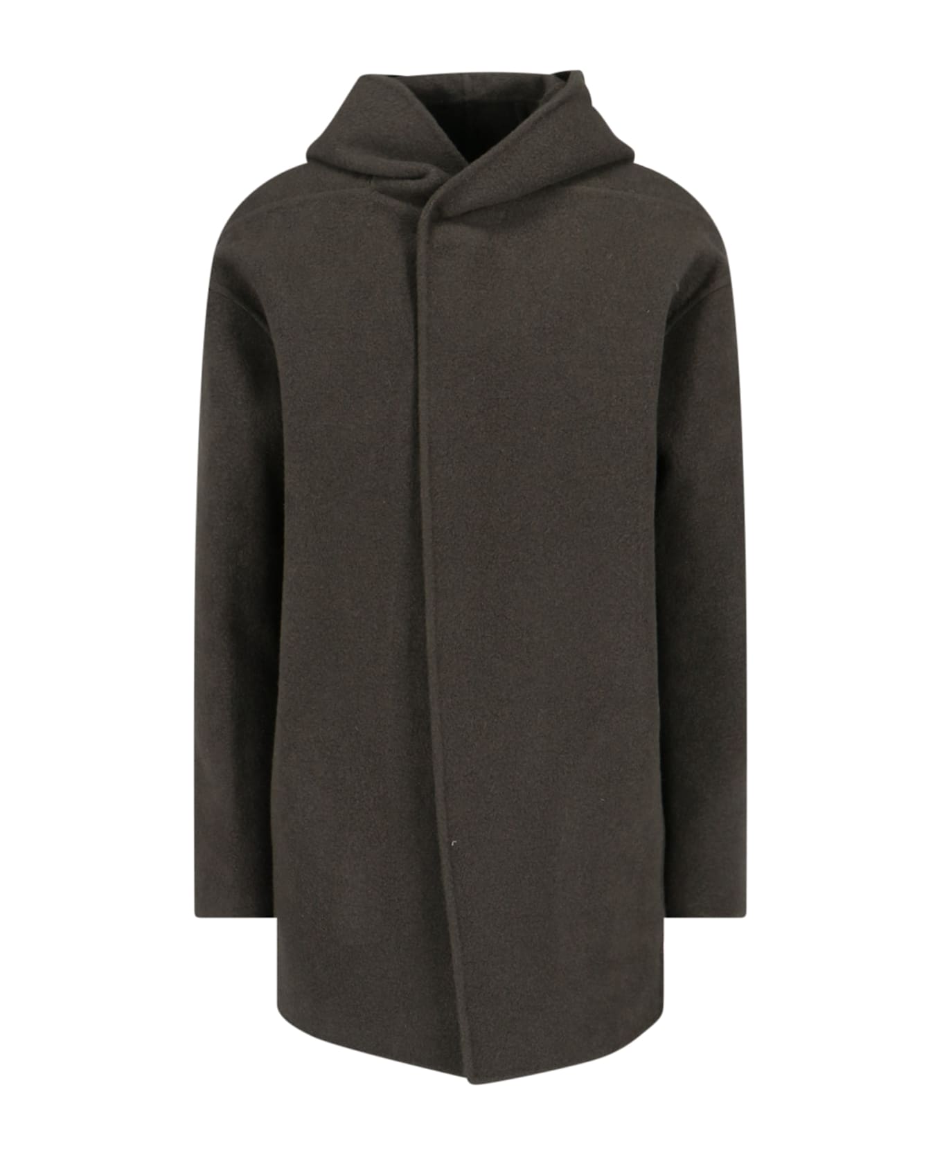 Rick Owens green cashmere midi hooded coat with top button closure, dropped shoulders, vent at the back hem, straight hem.