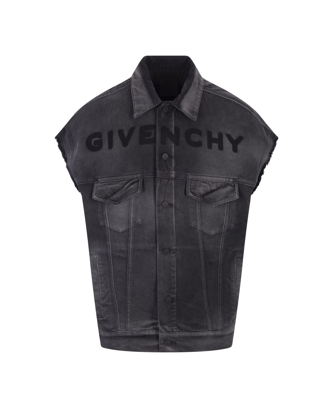 GIVENCHY oversize sleeveless jacket made of black cotton denim with washed-out effect. Model with classic collar, button and rivet closure 4G, two flap pockets on the bust and two raglan pockets on the side. The garment is finished with GIVENCHY signature embroidered on the chest with destroyed thread. Composition: 100% Cotton