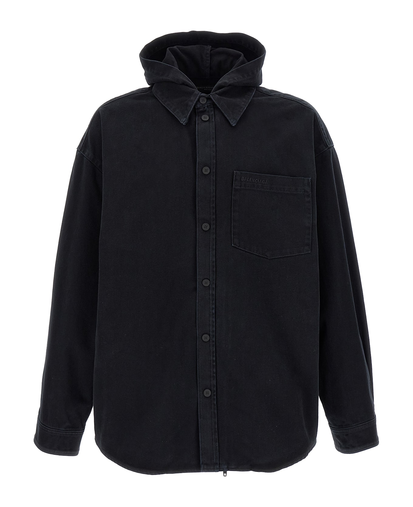 Denim overshirt, hooded shirt collar, pocket with front embroidered logo, front zip and snap button closure, side pockets, long cuffed sleeves.
