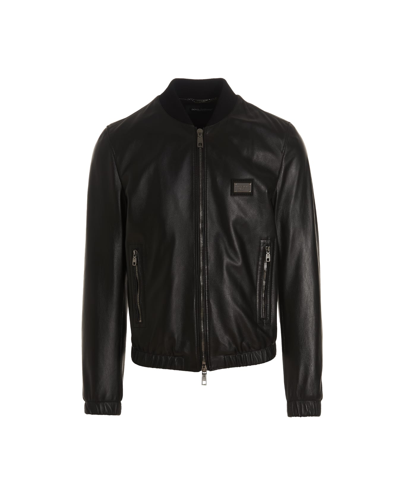 'DG Essential' leather bomber jacket with knit collar, zip closure, pockets, long sleeves with elastic cuffs, elastic hem, front logo plaque. Composition: 100% leather