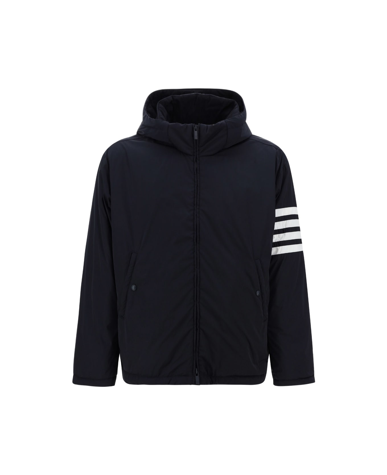 Down jacket by thom browne, front zipper closure, hooded design, high ribbed crew neck, elastic ribbed cuffs, elasticized hem, two side welt pockets with zipper for closure, iconic brand bands printed in contrast on left arm, regular fit. Composition: 100% % Polyester