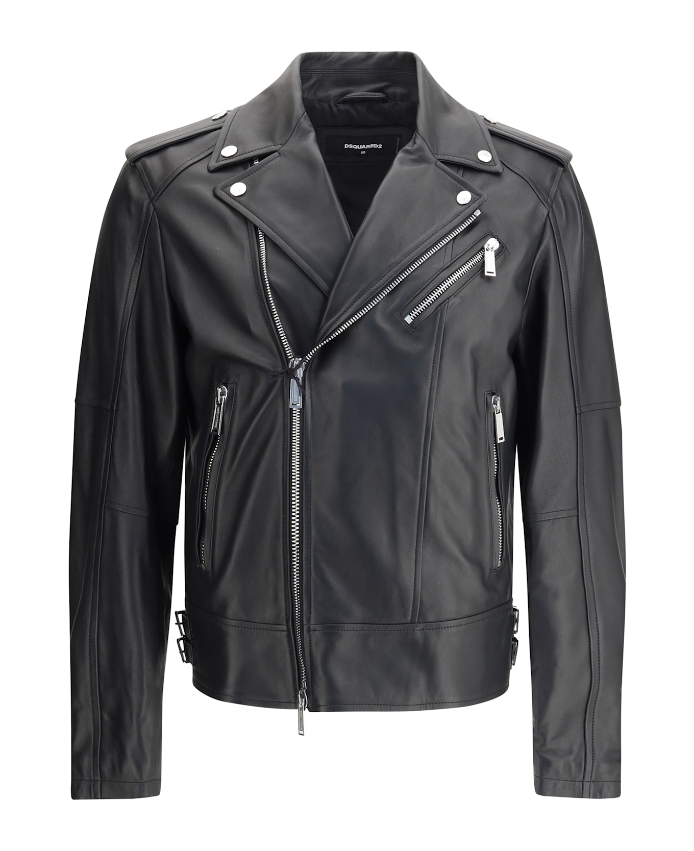Dsquared2's kiodo leather jacket features a lapel collar and a double-breasted, double-slider zipper closure. the functional design includes two zippered pockets, a heart point pocket also zippered, and zippered sleeve bottoms. distinctive details such as snap-buttoned frogs on the shoulders and buckle straps sewn to the hips complete this garment with a strong contemporary character.