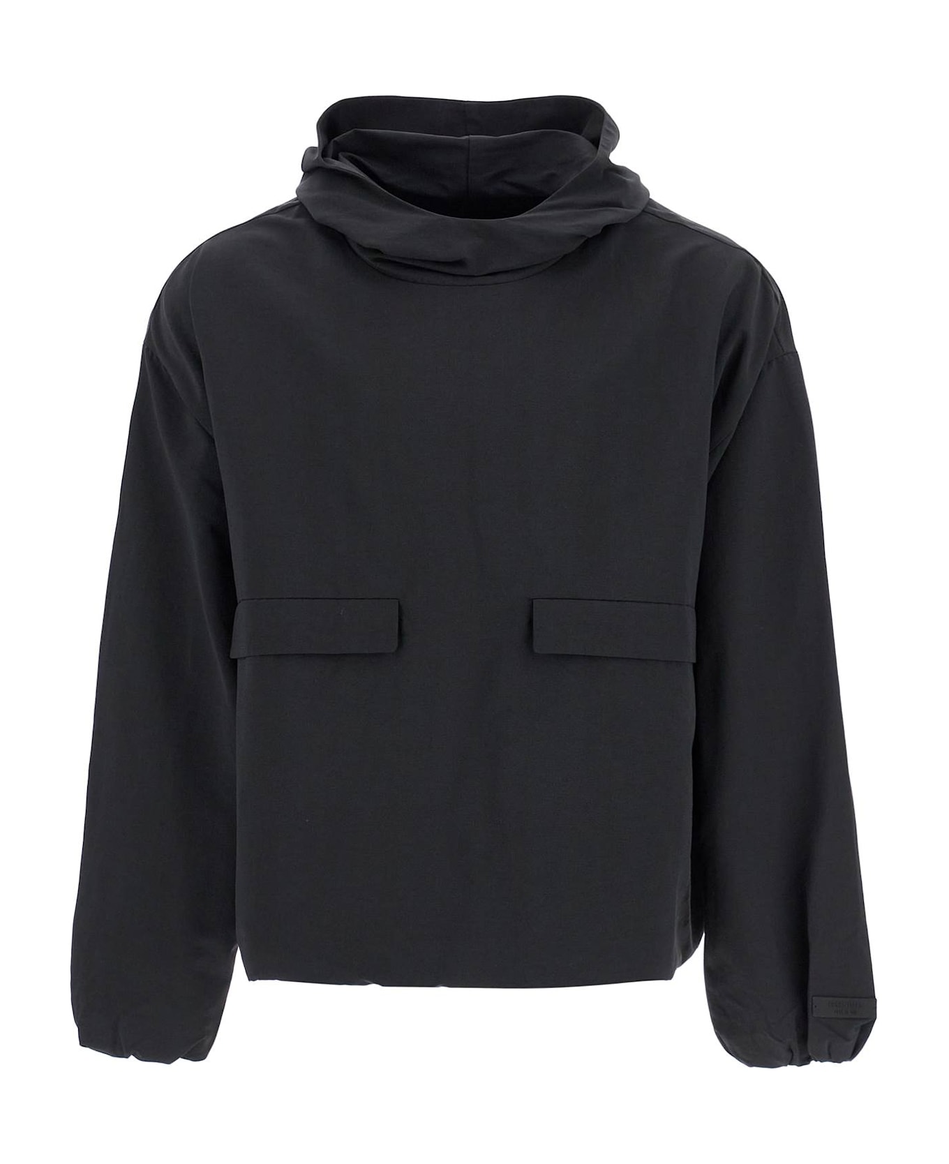 The Fear Of God Essentials Anorak is made of a blend of recycled nylon, featuring an oversized fit and complete with an integrated hood at the high collar and two front pockets with flaps. Elasticized cuffs and adjustable drawstring at the bottom. Lined with perforated technical fabric. The model is 182 cm tall and wears size M.