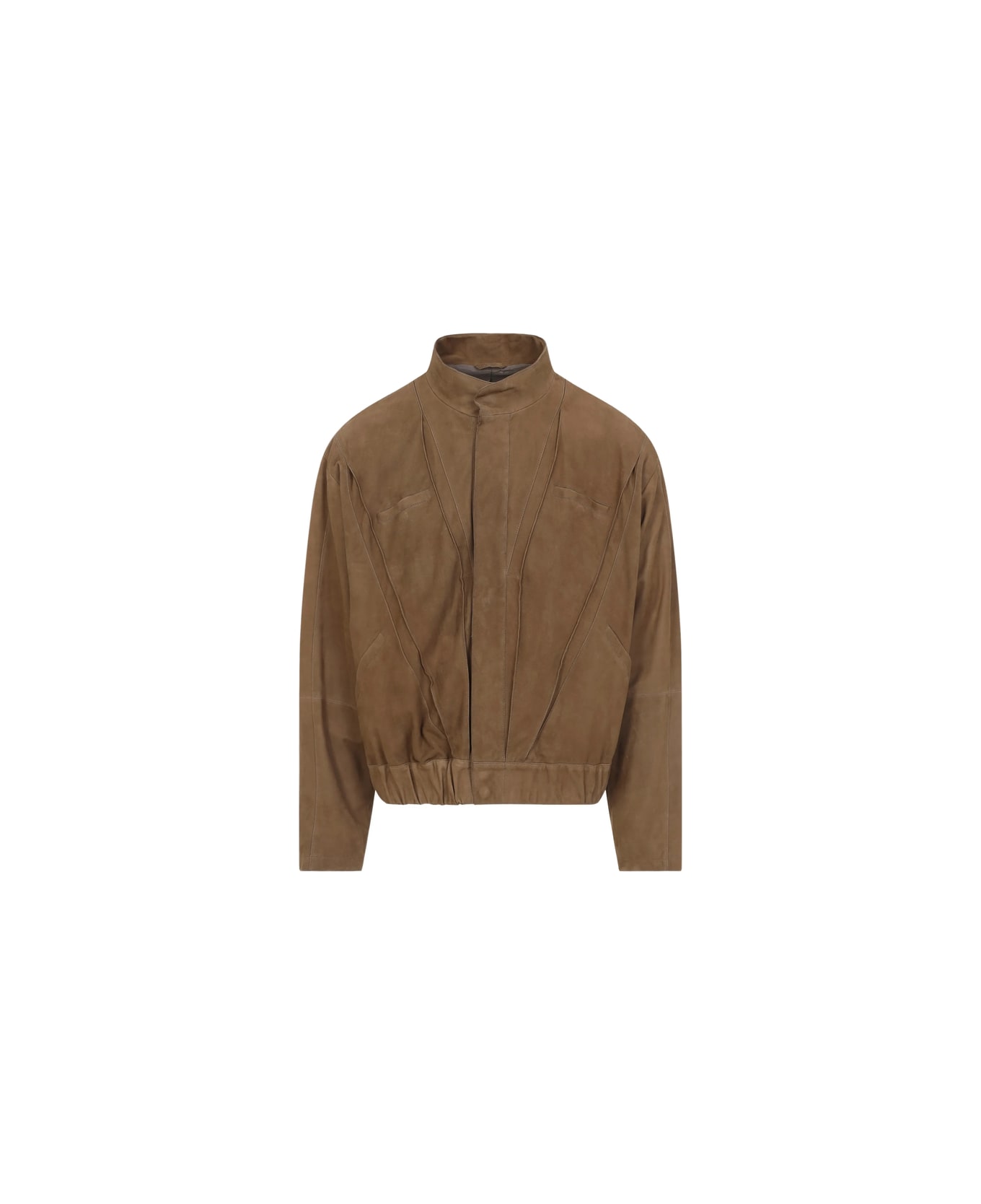 brown suede panelled construction elasticated hem high neck single chest pocket long sleeves
