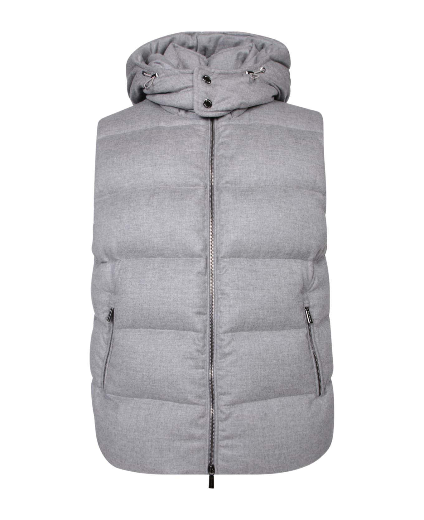 An essential piece for the winter season, this grey cashmere Moorer vest provides warmth and style. It features a sophisticated hood with metal finishes and a zip closure for practicality and versatility. Composition: 100% Cashmere