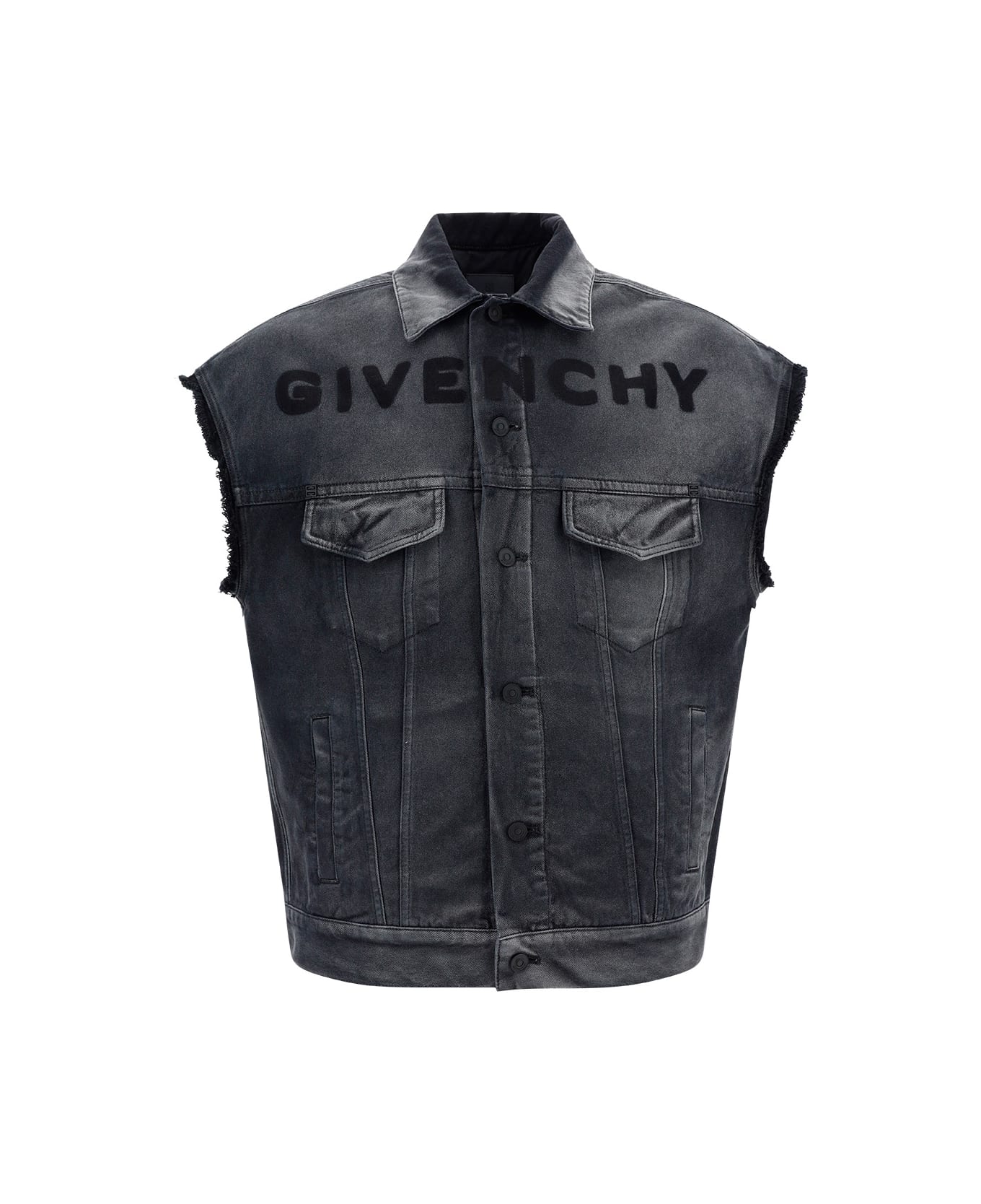 Cotton vest jacket by givenchy, denim design, classic collar, front button closure, two patch pockets on the front, two side welt pockets, iconic brand monogram printed on the front tone on tone, regular fit.