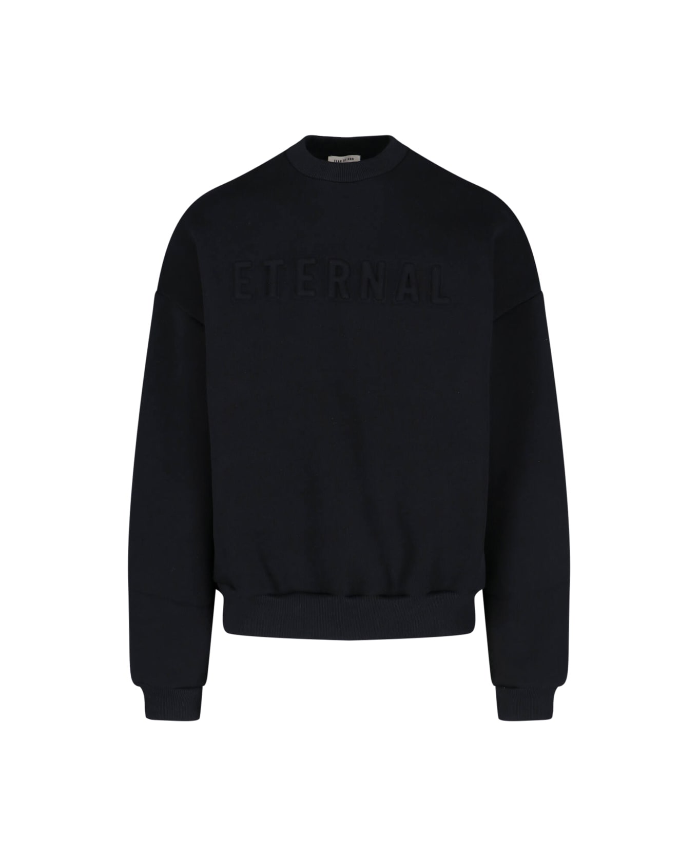 Fear Of God Eternal sweatshirt in black cotton blend with crewneck, ribbed trim, dropped shoulders, tone-on-tone "Eternal" embroidered logo, back logo label, and elastic hem.