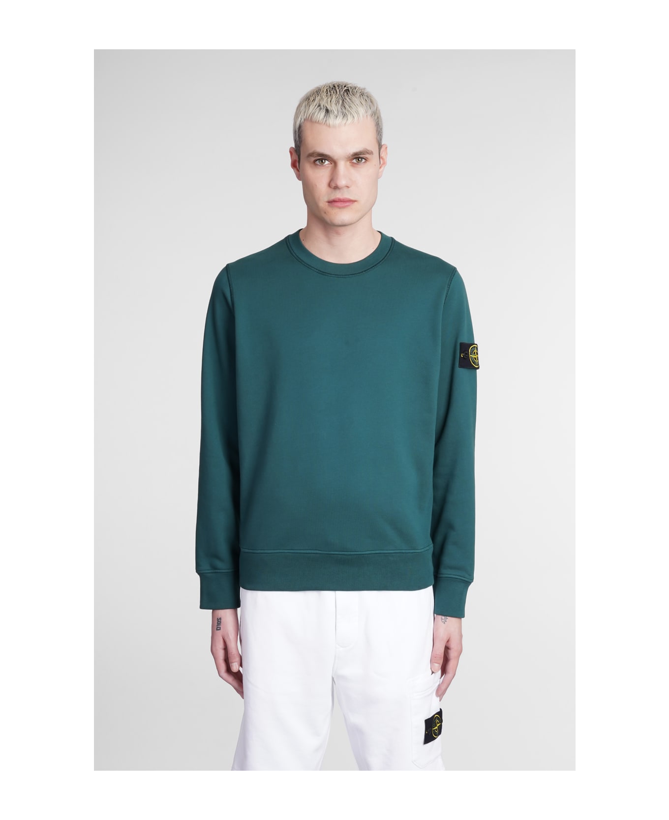 Sweatshirt in green cotton, round neck, long sleeves, ribbed cuffs and bottom, patch logo on sleeve, 100% cotton, Made in Romania, Model is 1. 83 and wears size M