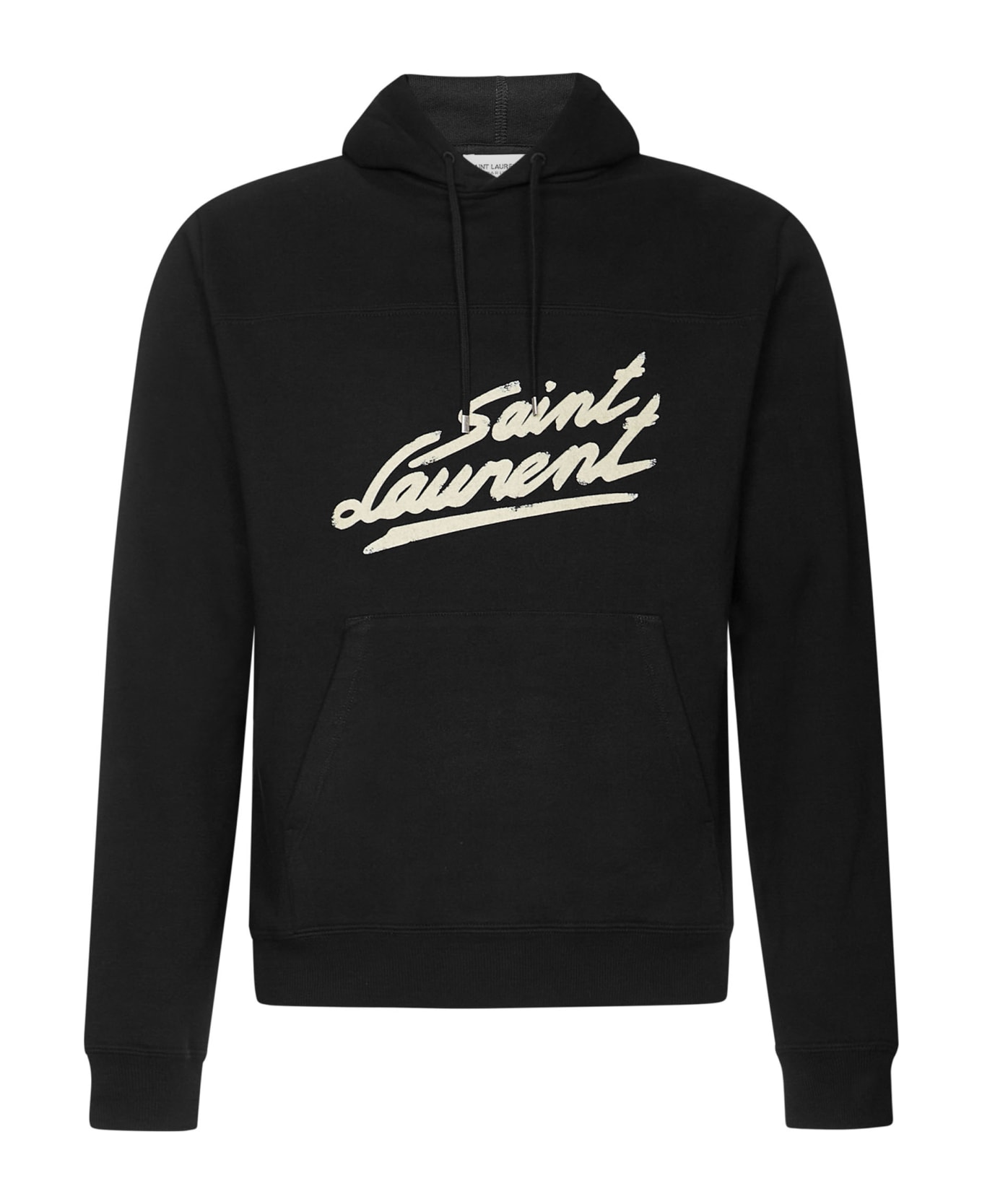 With the cream-colored logo printed on the front, the black Saint Laurent sweatshirt is the luxury addition to your casualwear. Hood with drawstring, kangaroo pocket and ribbed trims draw the essential model in cotton jersey, to be worn over skinny jeans and leather ankle boots in full Anthony Vaccarello style.