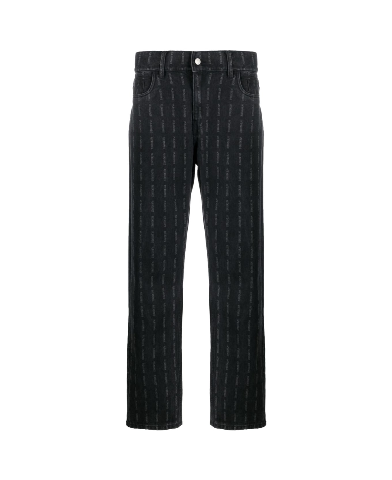 logo-printstraight-leg jeans from Pleasures featuring black, cotton, all-over logo print, mini logo tag, logo patch to the rear, belt loops, concealed fly and button fastening, classic five pockets and straight leg.