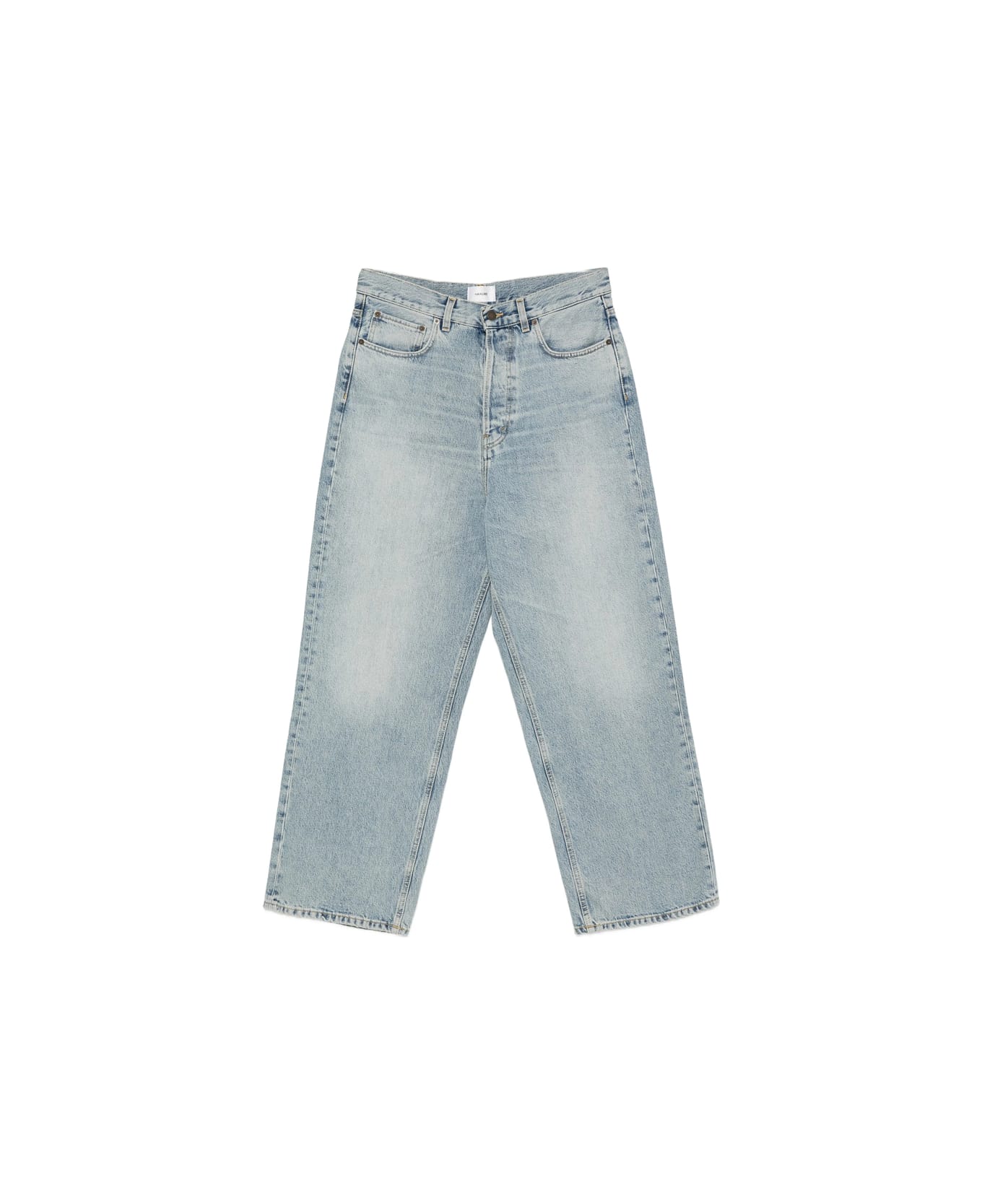 light blue cotton straight leg button fly five-pocket styling classic denim construction